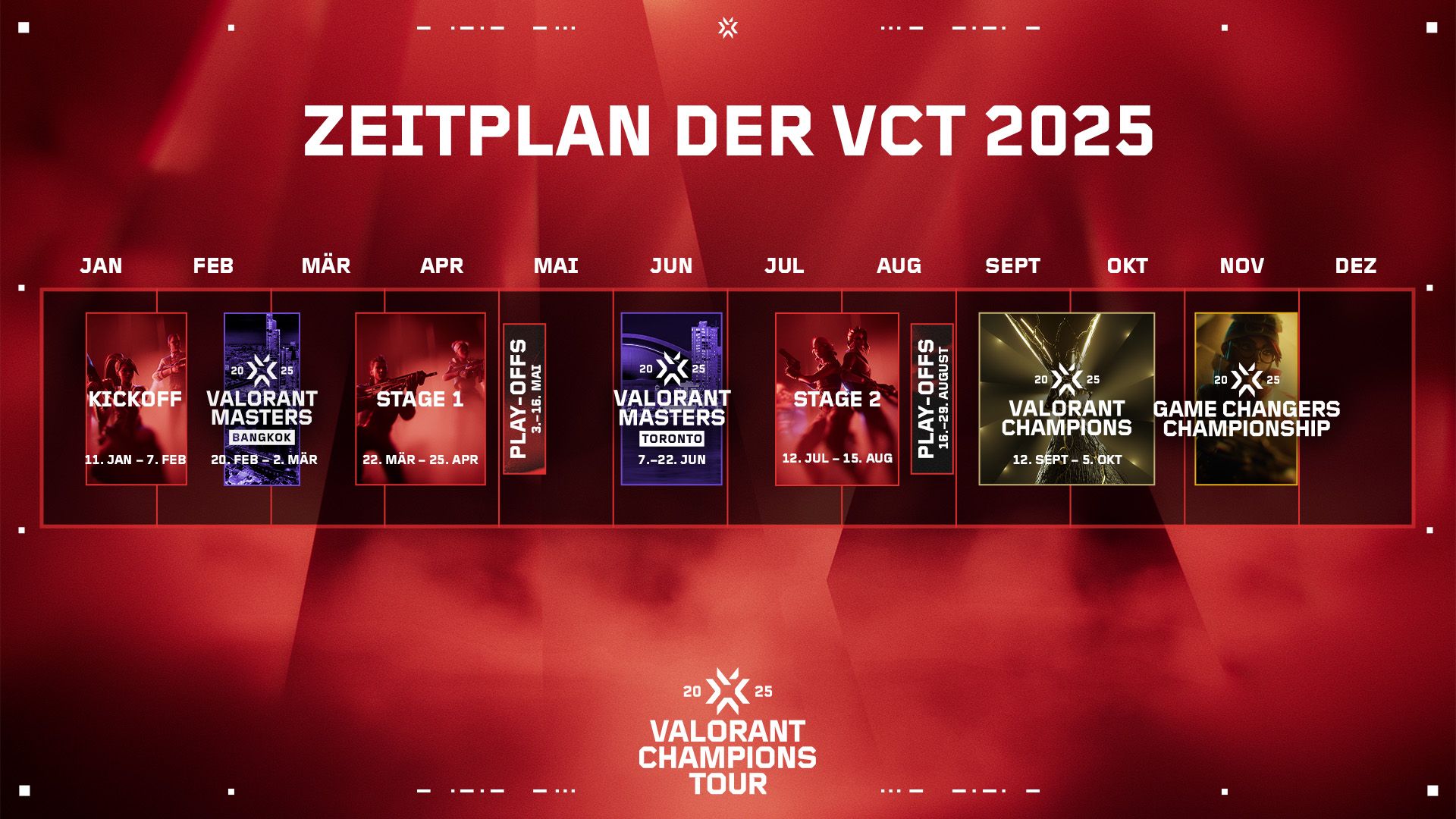 Im Jahr 2025 werden die Teams in einer Reihe von internationalen Ligaspielen und weltweiten Veranstaltungen gegeneinander antreten, um sich für die Champions Paris zu qualifizieren, wo der nächste VALORANT-Weltmeister gekrönt wird.