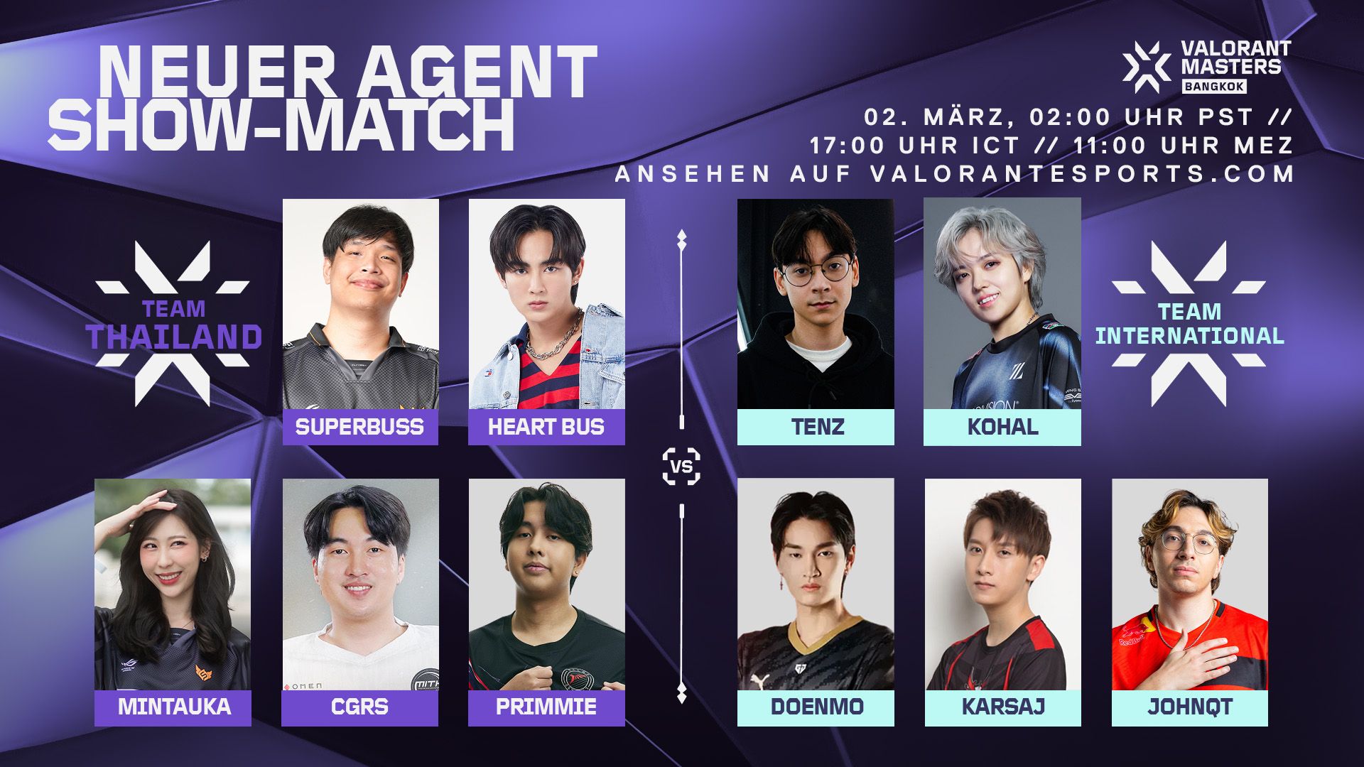 Mach dich bereit für einen phänomenalen Tag VALORANT beim Großen Finale des Masters Bangkok am Sonntag, den 2. März. Die Show startet mit der prismatischen Enthüllung eines brandneuen Agenten, gefolgt von einem speziellen Show-Match mit beliebten Persönlichkeiten, die sich mit dem neuesten Duellanten in die Schlacht stürzen!
