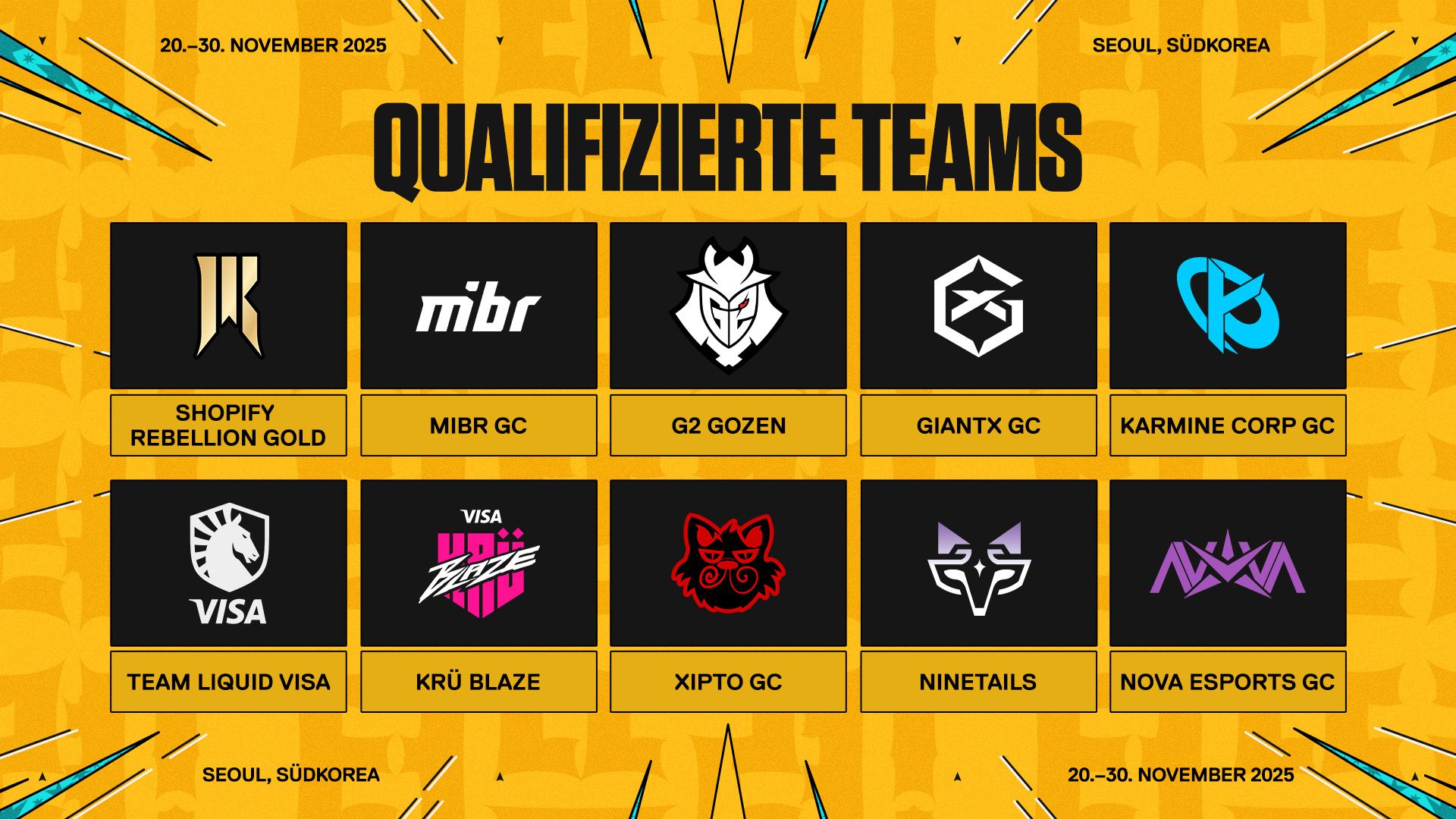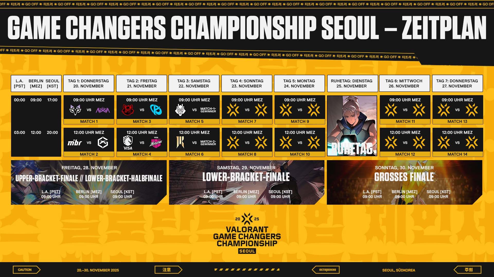 Nach einem Jahr voller Wettkämpfe und mehr als 80 Qualifikationsturnieren auf der ganzen Welt beginnt schon bald die Game Changers Championship! Vom 20.–30. November 2025 messen sich die besten GC-Teams in Seoul und krönen den nächsten VALORANT „Game Changers“-Champion! 10 Teams aus den Weltregionen NA, EMEA, CN, APAC, Brasilien und Lateinamerika haben sich durch Siege bei großen Turnieren oder durch Ansammeln der meisten Circuit-Punkte in ihrer Region qualifiziert. Die Teilnehmer-Teams müssen sich durch Doppeleliminierungs-Brackets kämpfen, bis nur noch ein einziges Team übrig ist!