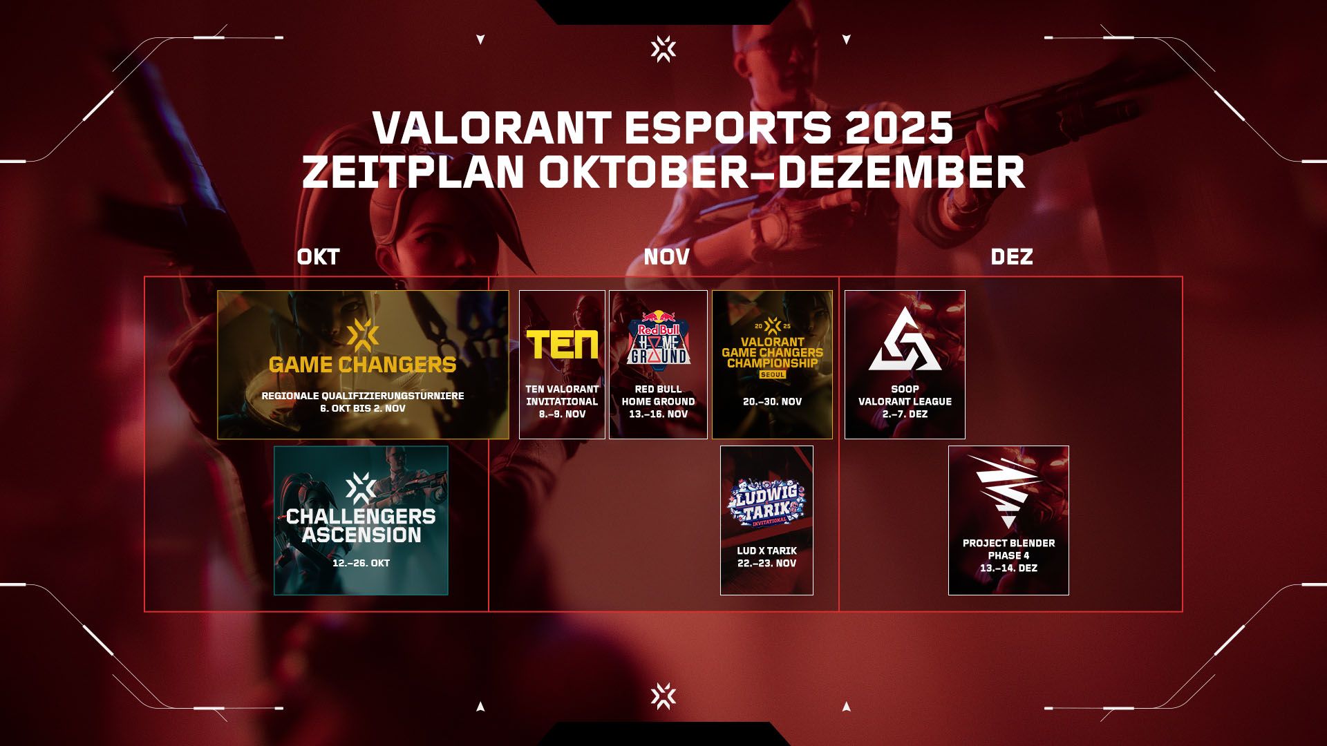 Das Champions Paris wird der Abschluss einer unvergesslichen VCT-Saison 2025, aber das ist noch nicht alles. Ab Oktober erwartet die Fans auf der ganzen Welt ein vollgepackter Wettbewerbskalender mit Turnieren und Events jedes Wochenende! Das beinhaltet „Ascension“, „Game Changers“ und mehr „VCT Partner Series“-Events.