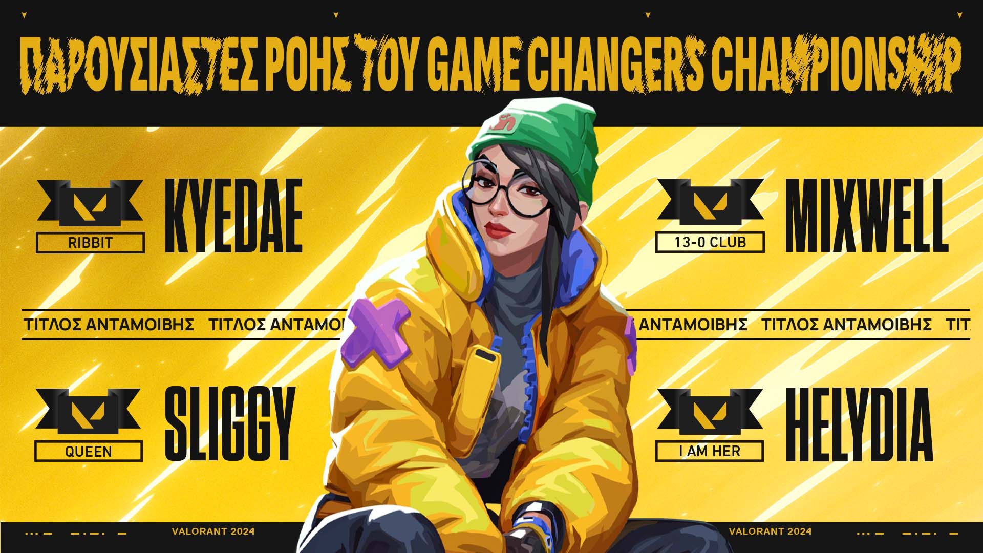 Το VCT Game Changers Championship θα ξεκινήσει στις 08 Νοεμβρίου και θα ολοκληρωθεί στις 17 Νοεμβρίου. Κατά τη διάρκεια του τουρνουά, η παρακολούθηση της επίσημης μετάδοσης ή των επίσημων Πάρτι Παρακολούθησης θα σας ανταμείψει με τον Τίτλο: ΚΕΝΤΡΙΚΟΣ ΧΑΡΑΚΤΗΡΑΣ