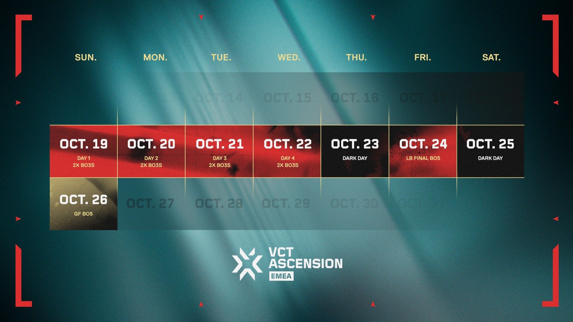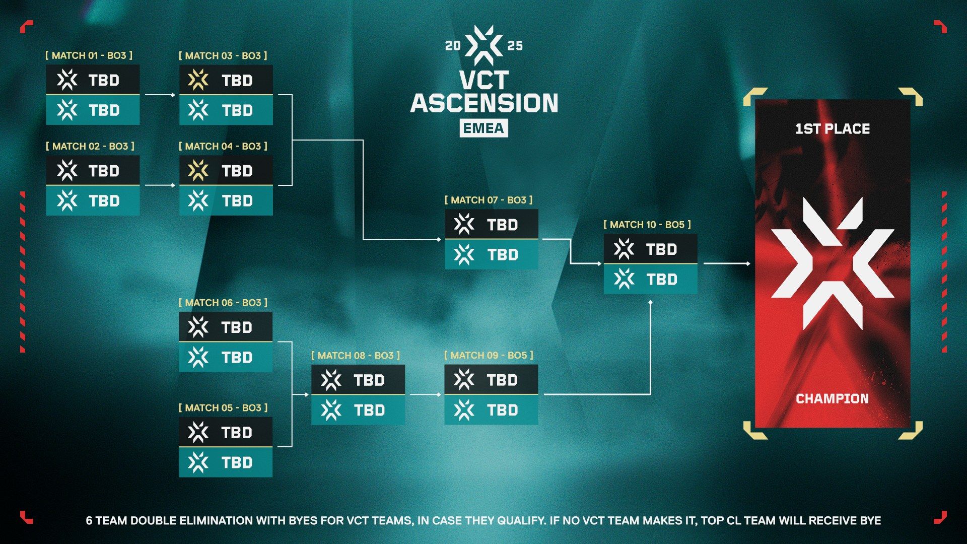 The tournament will feature a double-elimination bracket played in best-of-three series. The tournament builds with dramatic close, with best-of-five showdowns in the Lower Bracket Final and Grand Final to crown our Ascension champions, and determine who will join the VCT EMEA next season.