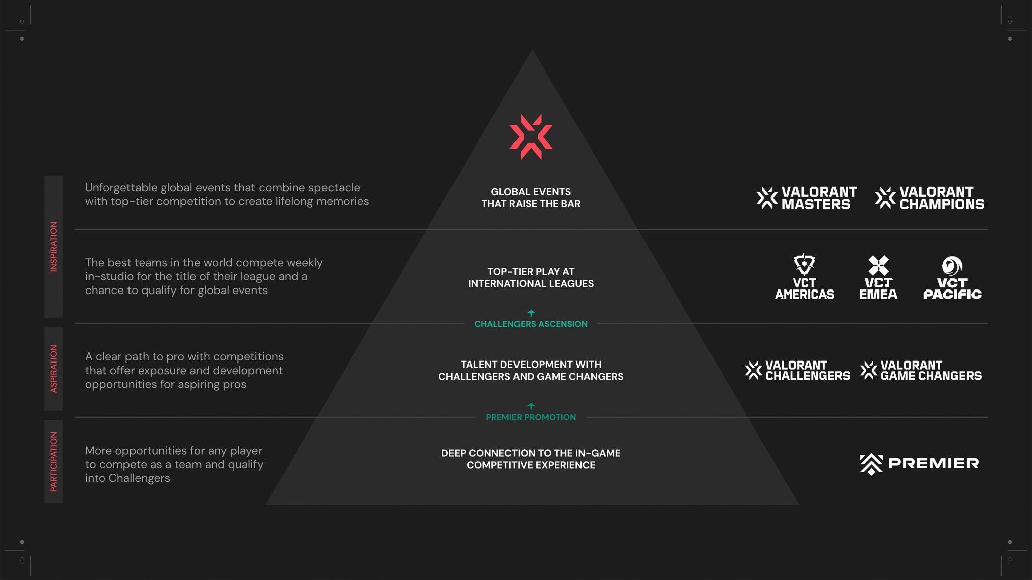 We aspire to build a sport that, among other things, is the ultimate manifestation of competitive VALORANT. The place to go to watch, learn from, and get inspired by the best VALORANT players on the planet. The sport should be accessible, welcoming of anyone who wants to participate, and have a clear path to pro.
