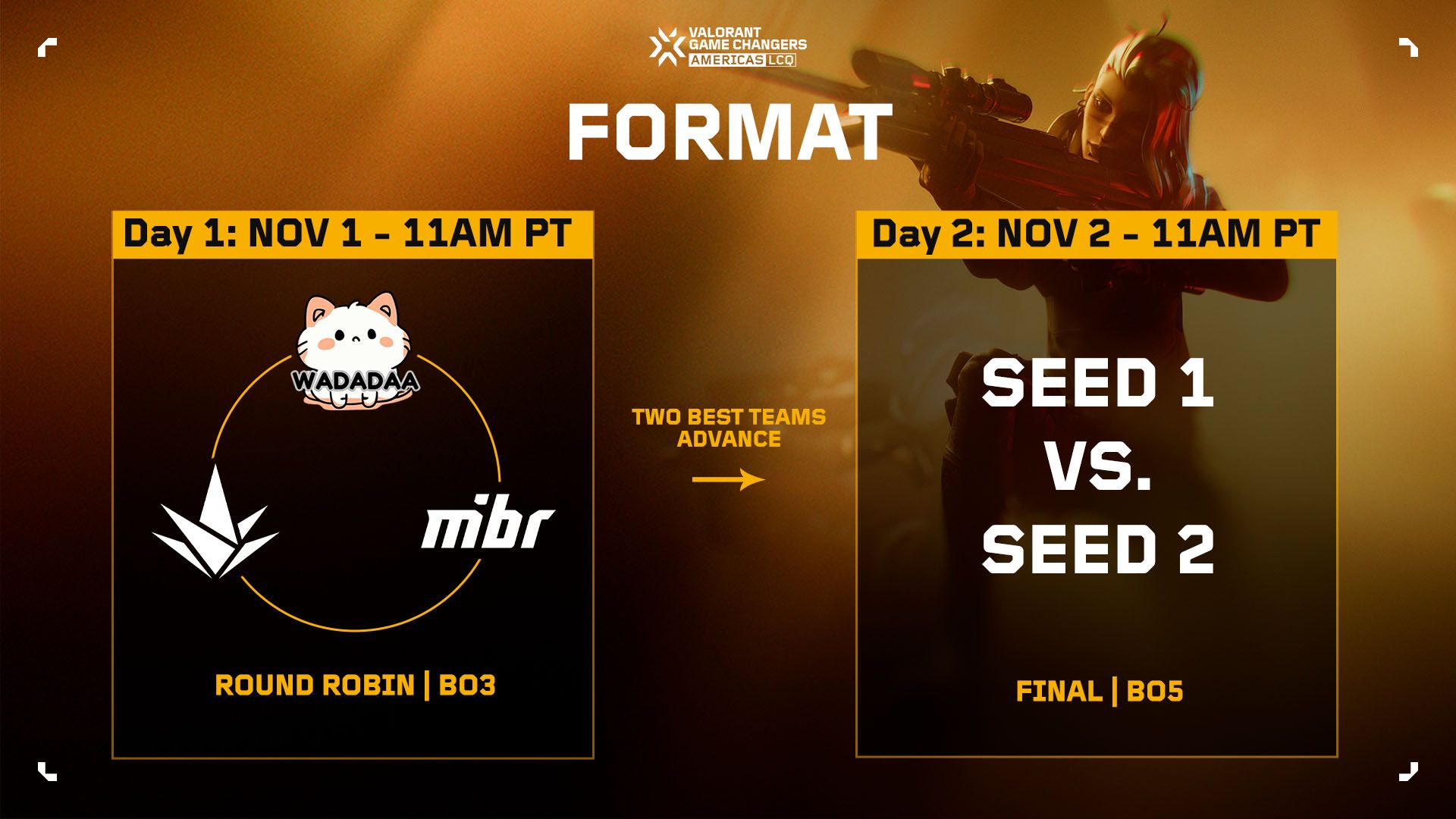 Game Changers Americas LCQ will bring together representatives from each region (NA/BR/LATAM) in a single group, in a round-robin format, with BO3 matches held on November 1st, starting at 11AM PT. The top two teams in the group advance to Finals in the following day (November 2), which will be BO5, also at 11AM PT.