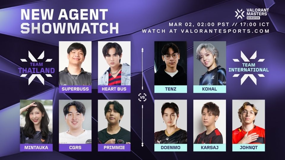 Get ready for a showstopper day of VALORANT at Masters Bangkok Grand Finals on Sunday, March 2nd. We’re kicking off the show with a prismatic reveal of a brand-new Agent, followed by a special showmatch featuring your favorite creators duking it out with the newest Duelist!