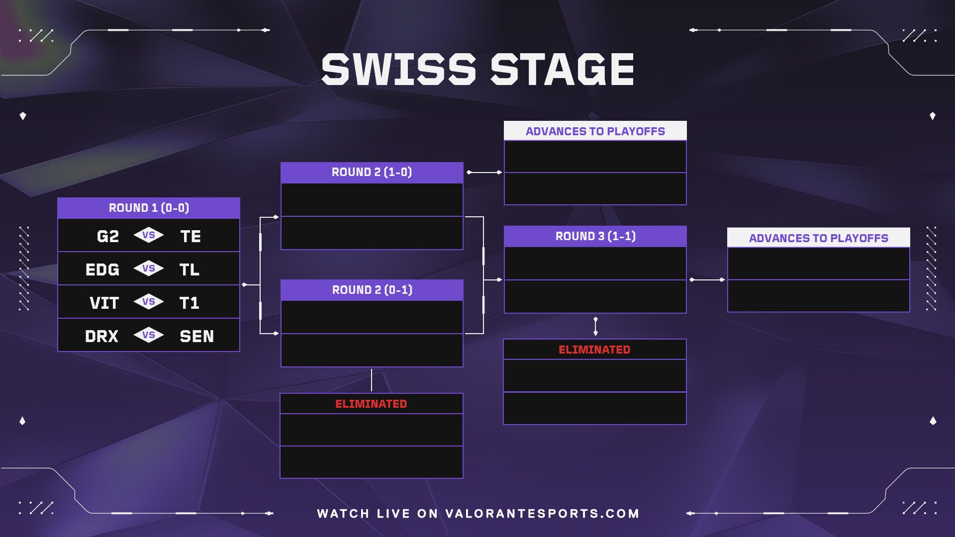 In the Swiss Stage, teams will need to secure 2 victories before they accumulate 2 losses across a maximum of three rounds to advance out of Swiss. Each match will be a Best of Three series.