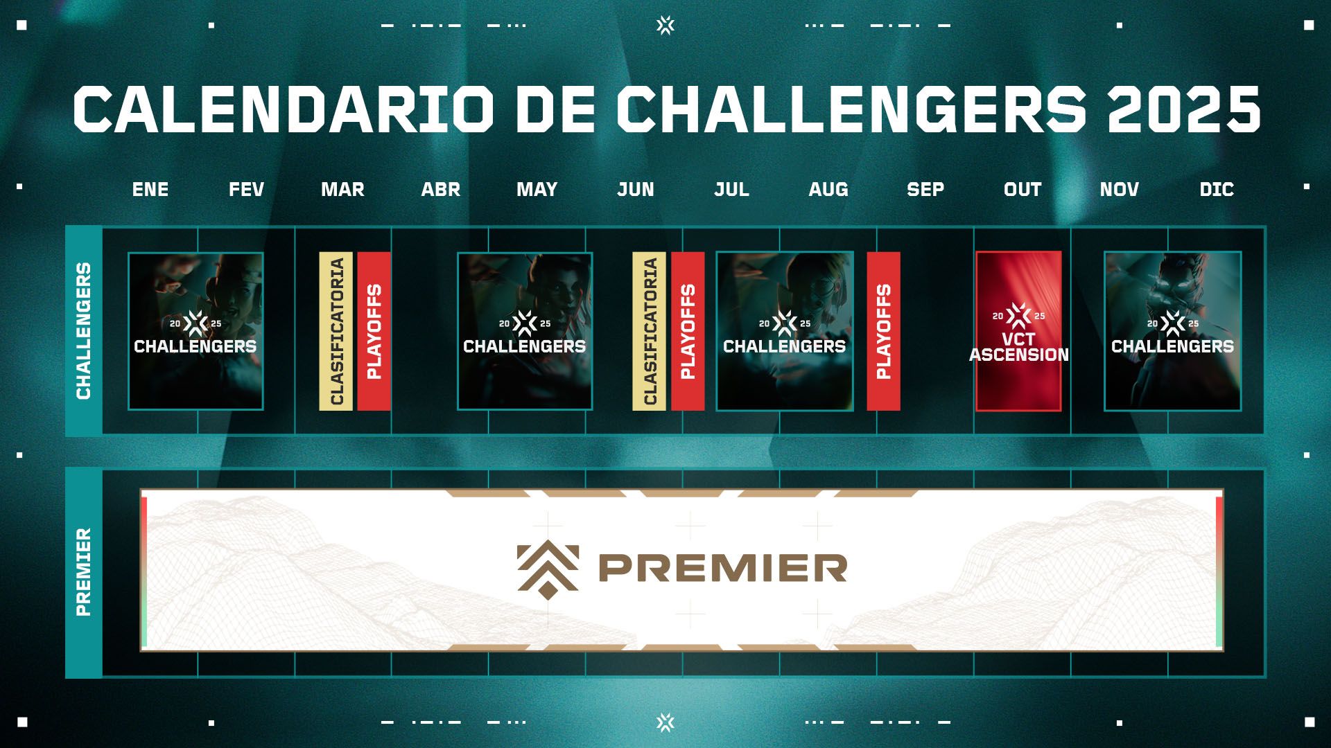 A medida que el año llega a su fin, queremos compartir algunas noticias sobre la temporada 2025 del Challengers. La próxima temporada queremos seguir incrementado la conexión entre el Challengers y todas las partes del ecosistema del VCT. Las ligas Challengers son un nivel esencial de la competición donde los jugadores emergentes pueden perfeccionar sus habilidades y ganar reconocimiento por su talento. De forma similar al 2024, el Challengers durará el año entero: comenzará en enero, llegará a su punto álgido con Ascension en octubre y concluirá en diciembre con los torneos de Challengers y Premier.
