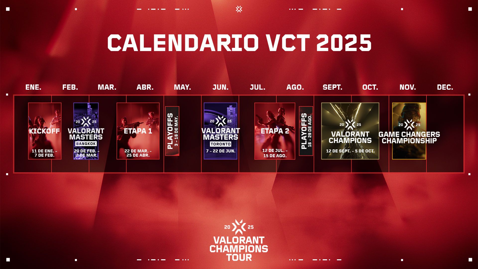 ¡La temporada 2025 de los esports de VALORANT empieza en enero y viene con nuevos cambios, nuevos equipos y nuevos formatos! ¿Tu primera vez? Te ayudamos. Aquí está todo lo que tienes que saber antes de que inicie el VCT. Con equipos nuevos que lograrán ascender de EMEA, Pacific, CN y Americas, esta temporada nos trae el año de competencia más grande de nuestra historia.