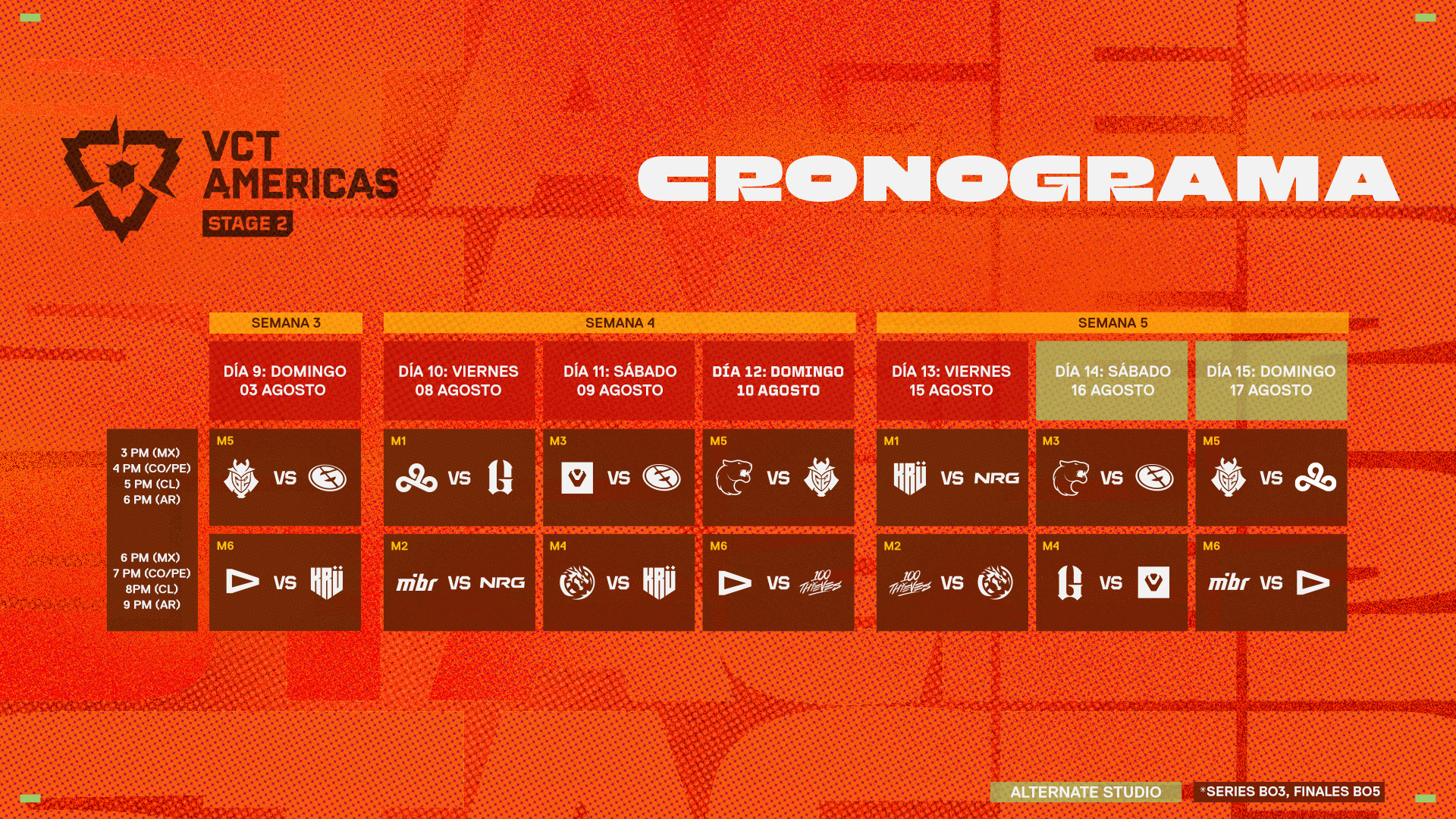 ¡Sigue toda la acción en Twitch o YouTube! Las transmisiones oficiales del VCT Americas estarán disponibles en inglés, español y portugués. Las fechas y los horarios de transmisión se actualizarán en tiempo real a lo largo de la temporada en https://valorantesports.com/es-MX/