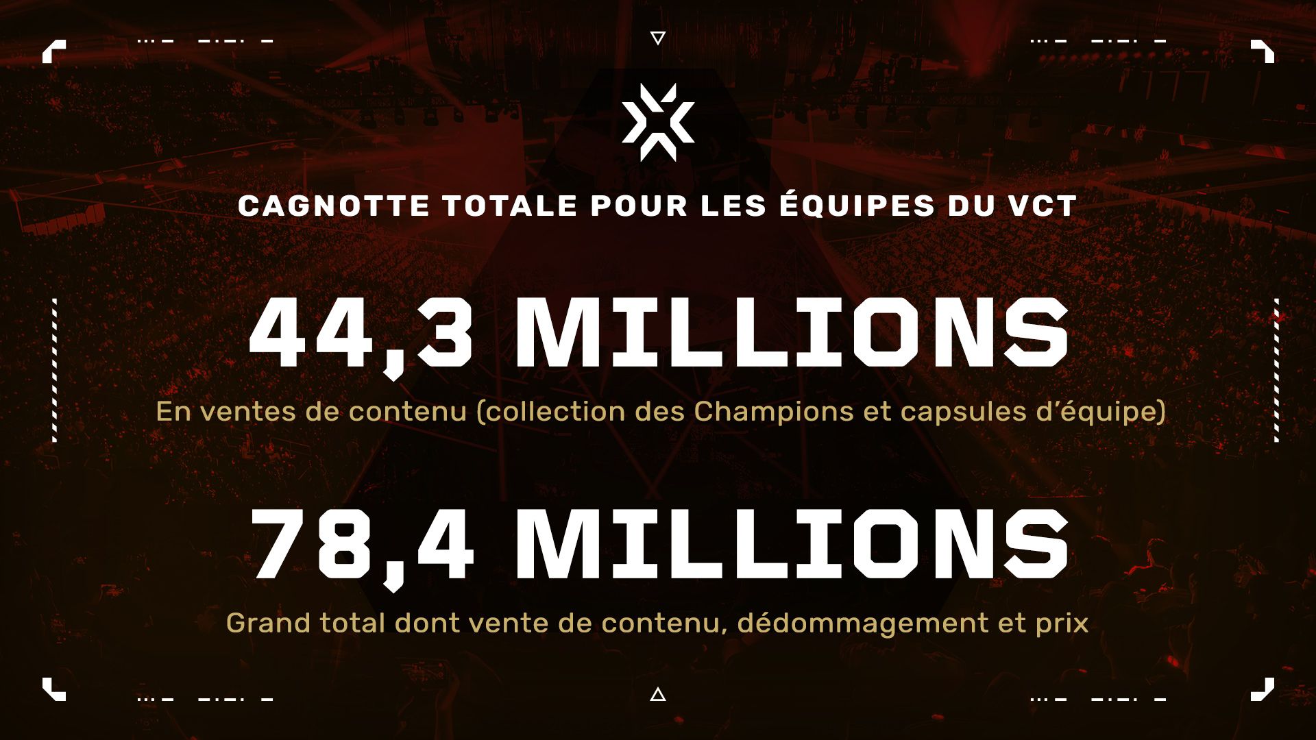 Grâce à vous, le VCT a distribué 78,4 millions de dollars aux équipes, dont 44,3 millions de dollars issus de la vente de contenu.