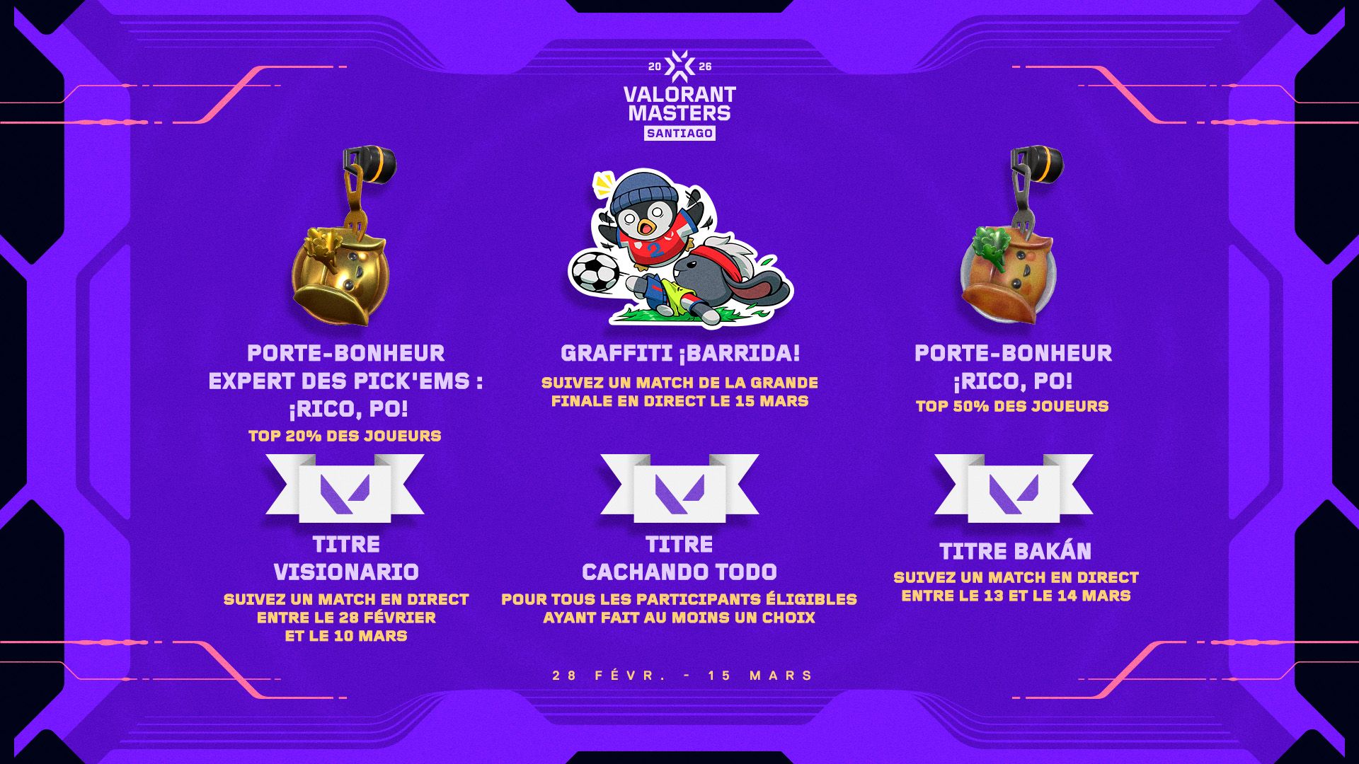 Suivez les Masters Santiago en direct pour obtenir des récompenses ! Vous pouvez obtenir un titre et un graffiti inédits rien qu'en regardant les matchs. Validez vos pronostics pour les pick'ems et comparez-vous aux autres joueurs du monde entier !