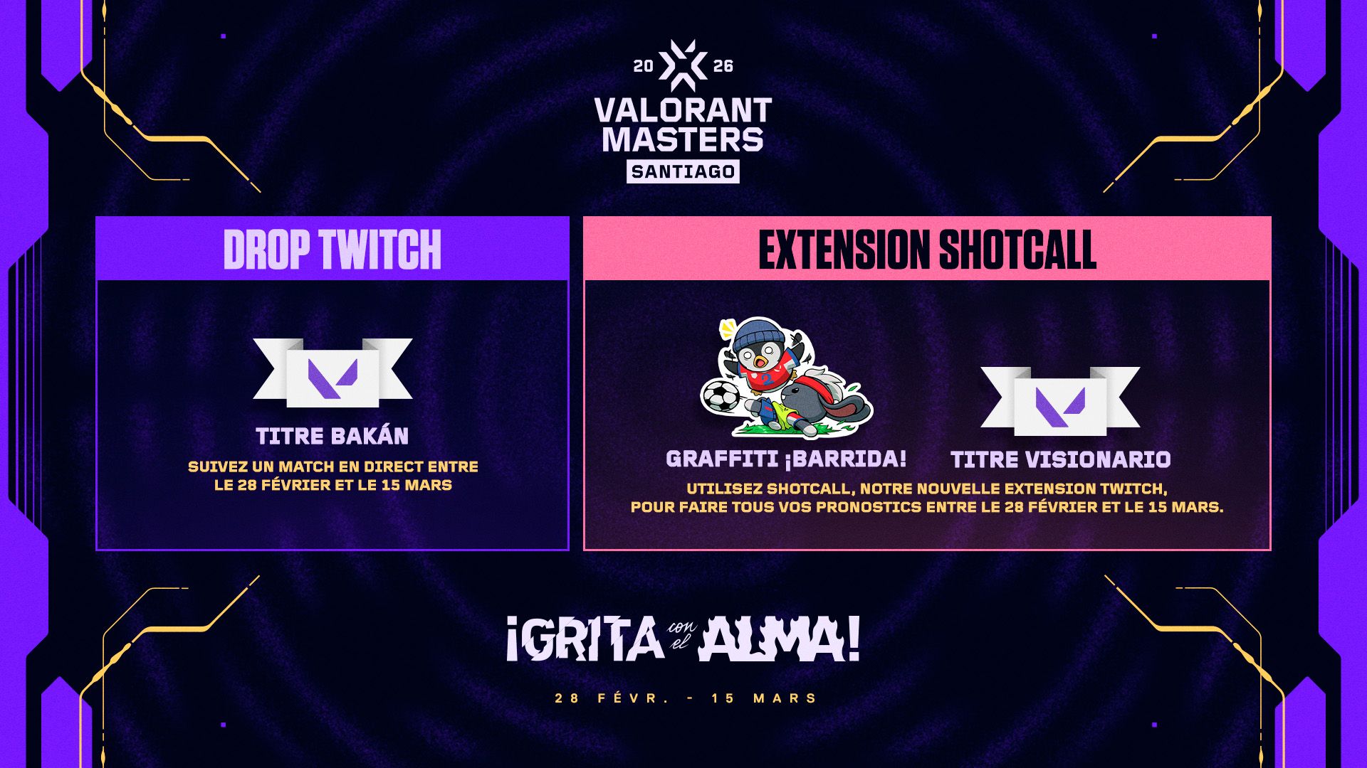 Shotcall sera également disponible pour les Masters Santiago ! C'est une expérience unique en direct sur Twitch qui vous permet de faire des pronostics sur les prochaines actions lors des diffusions officielles du VCT. Essayez de prédire les cartes, les résultats des manches ou les prochains clutchs en temps réel et obtenez des points à chaque fois que votre prédiction se réalise pour grimper dans le classement ! Disponible uniquement sur PC via l'extension Twitch.