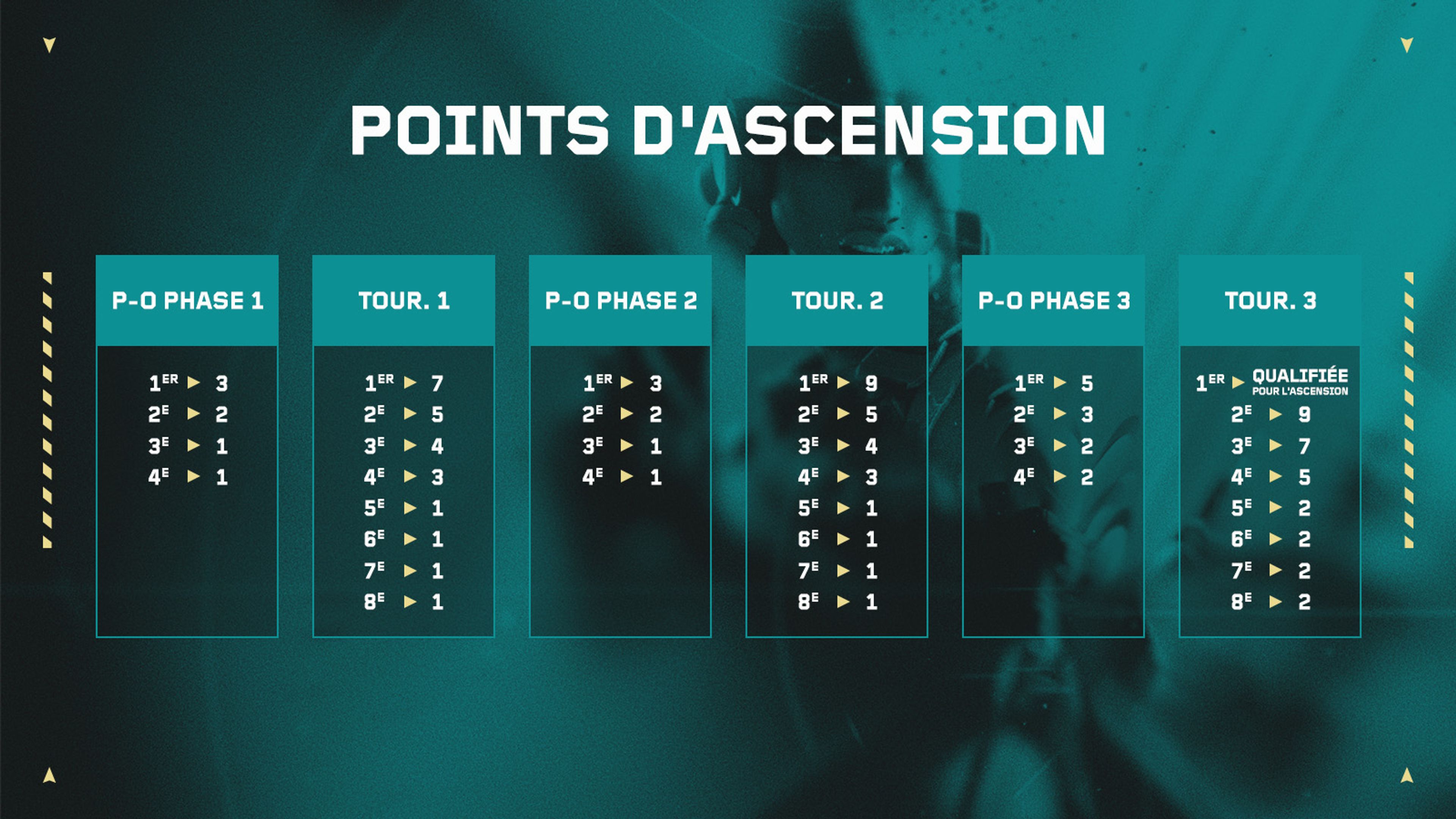 Le gagnant des derniers Challengers EMEA en phase 3 sera directement invité à l'Ascension. Les autres équipes seront qualifiées en fonction de leurs points de championnat.