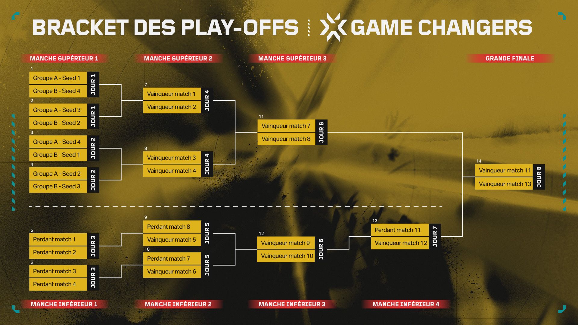 Pour rappel, les 4 meilleures équipes des deux groupes se qualifieront pour les play-offs, qui se joueront en bracket à élimination double. Les play-offs auront lieu en ligne, en dehors du cadre de la finale. Pour atteindre la finale, il faudra remporter 3 manches en bracket supérieur ou 4 manches en bracket inférieur.