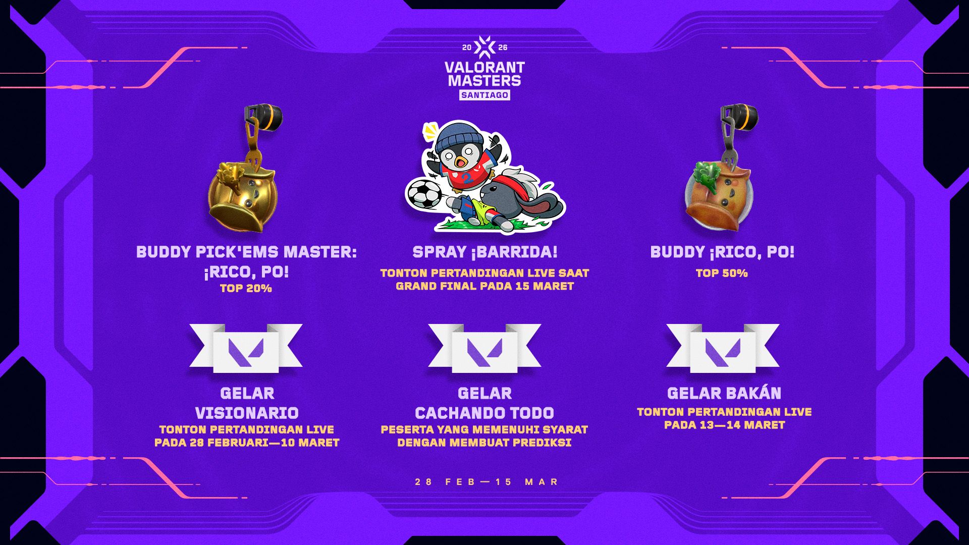 Masters Santiago juga akan menghadirkan Shotcall, ekstensi Twitch live yang memungkinkan kamu memprediksi apa yang akan terjadi selanjutnya selama siaran resmi VCT. Buat prediksi tentang peta, ronde, dan momen clutch secara real time, dapatkan poin untuk prediksi yang tepat, dan tingkatkan posisi di leaderboard global. Tersedia di desktop melalui ekstensi Twitch ini.