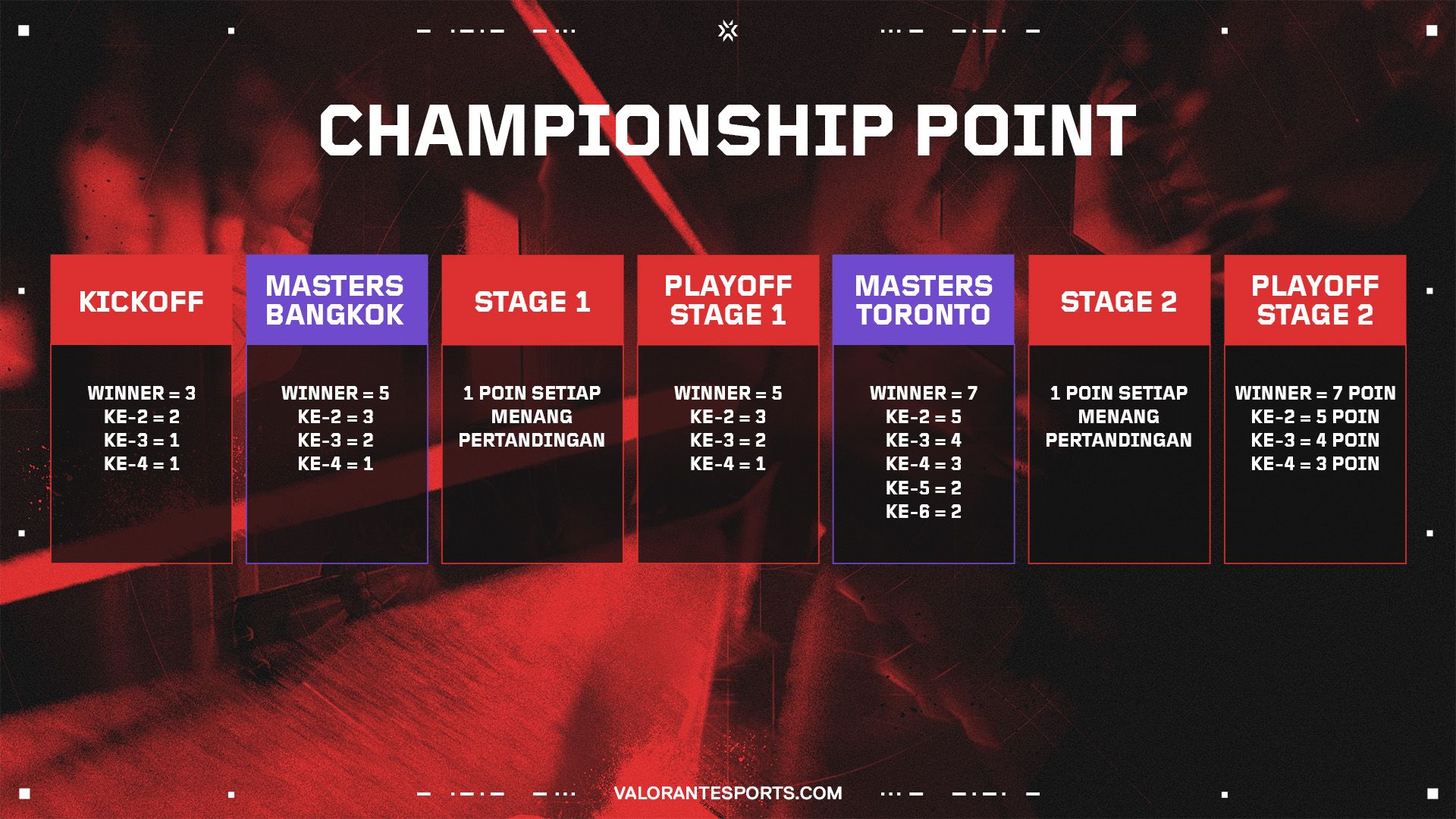 Mirip tahun lalu, Championship Point akan didistribusikan di setiap stage dan kompetisi. Tujuan kami adalah memastikan semua bagian season memiliki risiko tinggi dan berdampak. Oleh karena itu, kami membuat dua perubahan penting: distribusi poin yang lebih mendalam di Masters dan Playoff, serta menjadikan stage bersifat mandiri, sehingga semua tim memiliki awal yang baru pada pertengahan season.