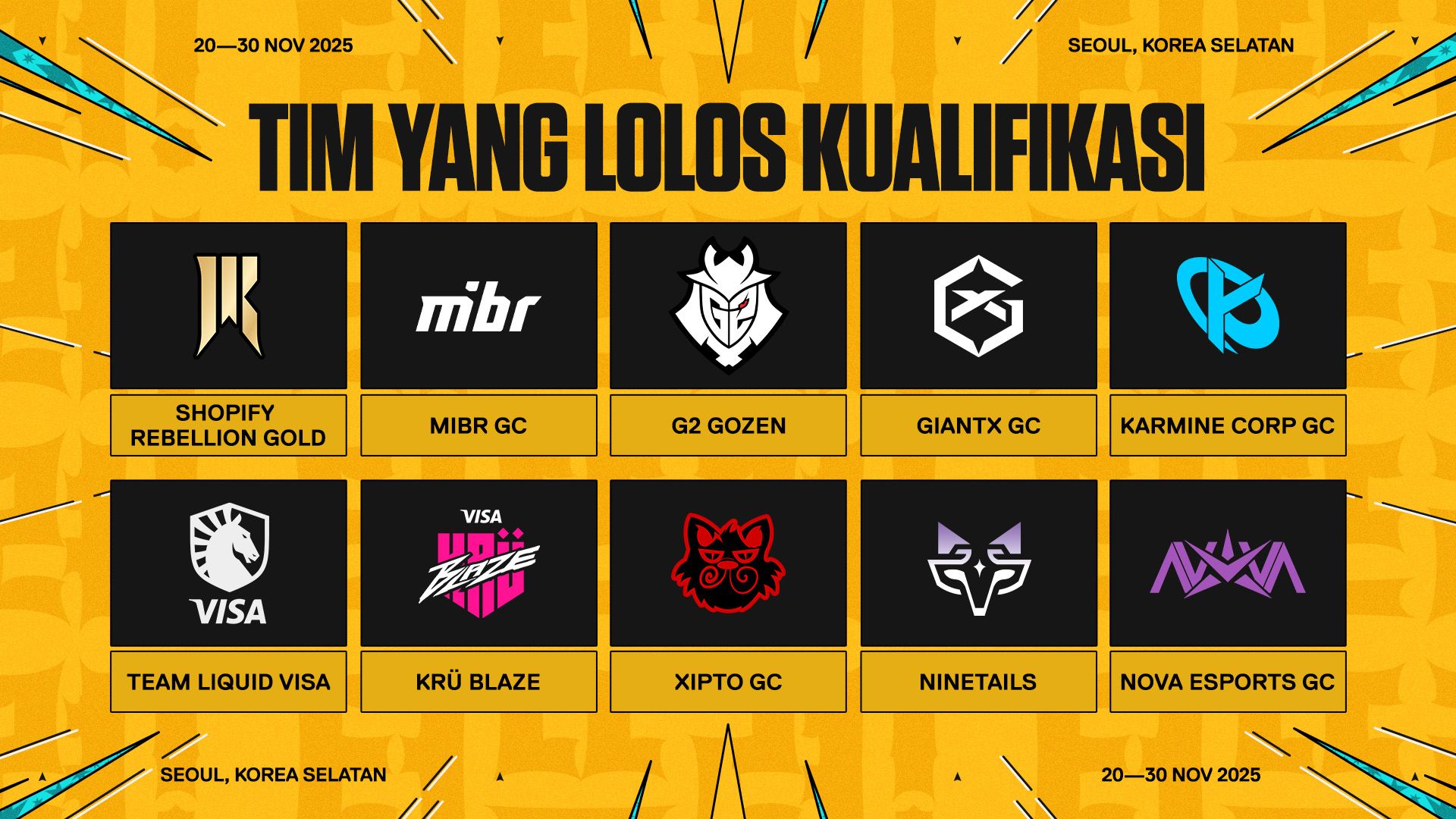 Setelah setahun penuh kompetisi dan lebih dari 80 event Qualifier di seluruh dunia, Game Changers Championship akan segera dimulai! Mulai tanggal 20 hingga 30 November 2025, Seoul akan menjadi tuan rumah event puncak sirkuit GC dan akan menobatkan Juara VALORANT Game Changers yang berikutnya! Sepuluh tim yang mewakili North America, EMEA, CN, APAC, Brazil, dan Latin America meraih kualifikasi mereka dengan mendapatkan kemenangan di event besar atau dengan mengumpulkan poin sirkuit tertinggi di regional mereka. Para peserta akan bersaing dalam double elimination bracket sampai hanya tersisa satu tim yang bertahan!