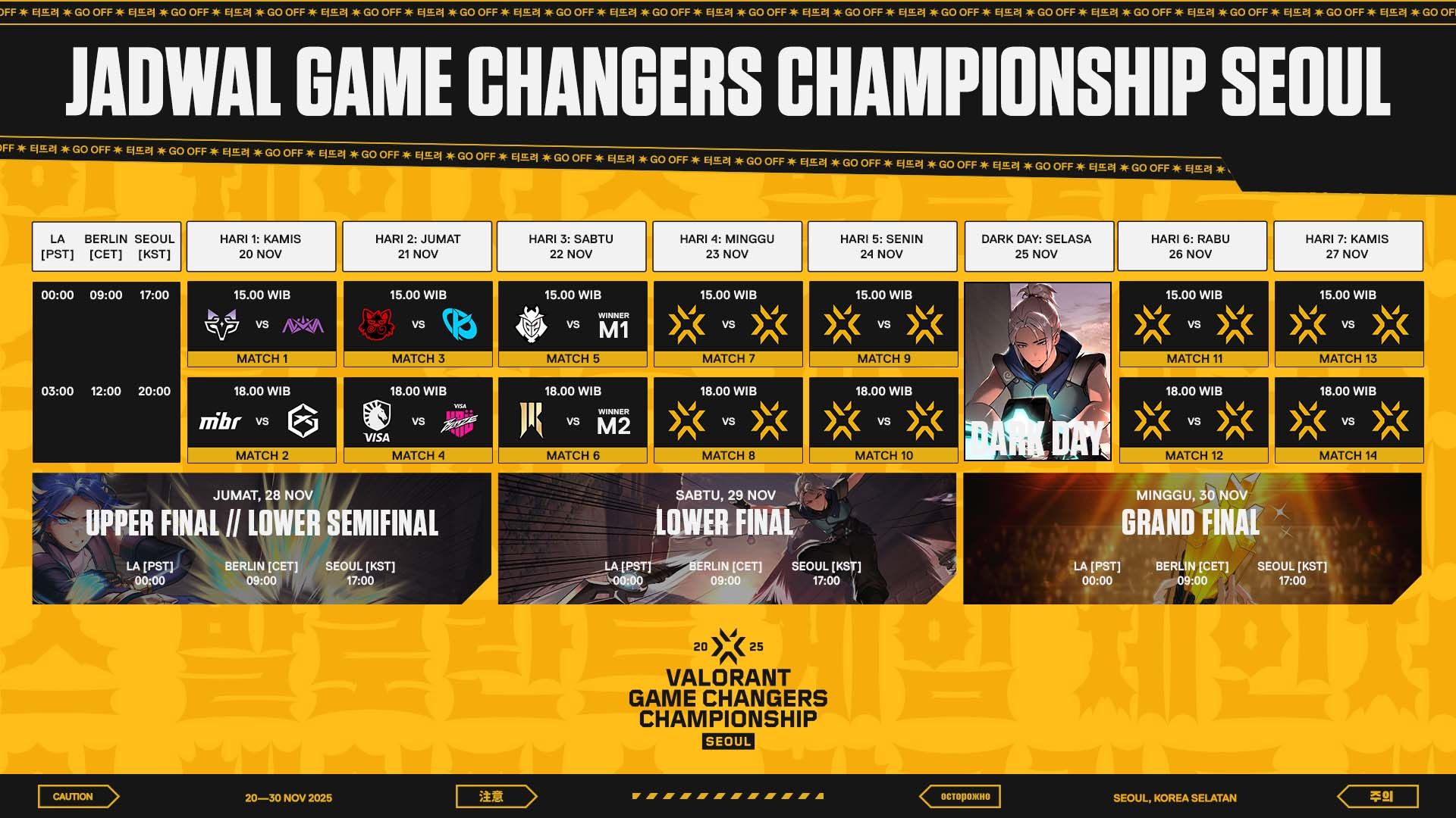 Pick’Ems Group Stage: Dibuka pada 14 November pukul 00.00 WIB; prediksi akan dikunci 20 menit sebelum game pertama turnamen dimulai, sekitar pukul 15.20 WIB pada 20 November.
