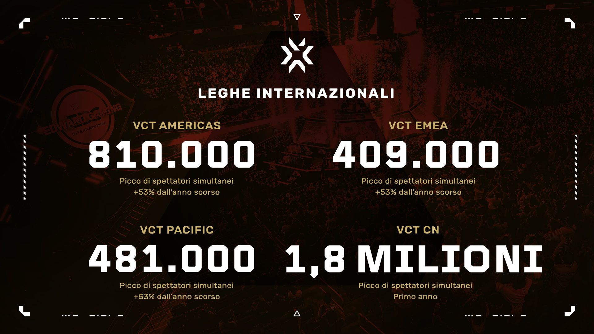 È stata la nostra stagione migliore in assoluto. Ha infranto praticamente ogni record. Da tempo diciamo che il VCT è l'eSport in più rapida crescita al mondo. Beh, il 2024 ha confermato VALORANT come lo sparatutto in soggettiva più guardato al mondo, nonché uno degli eSport più popolari tra tutti i titoli e i generi. È stato un notevole anno di espansione per il gioco, in nuove regioni e su nuove piattaforme, e lo sport è cresciuto con esso.