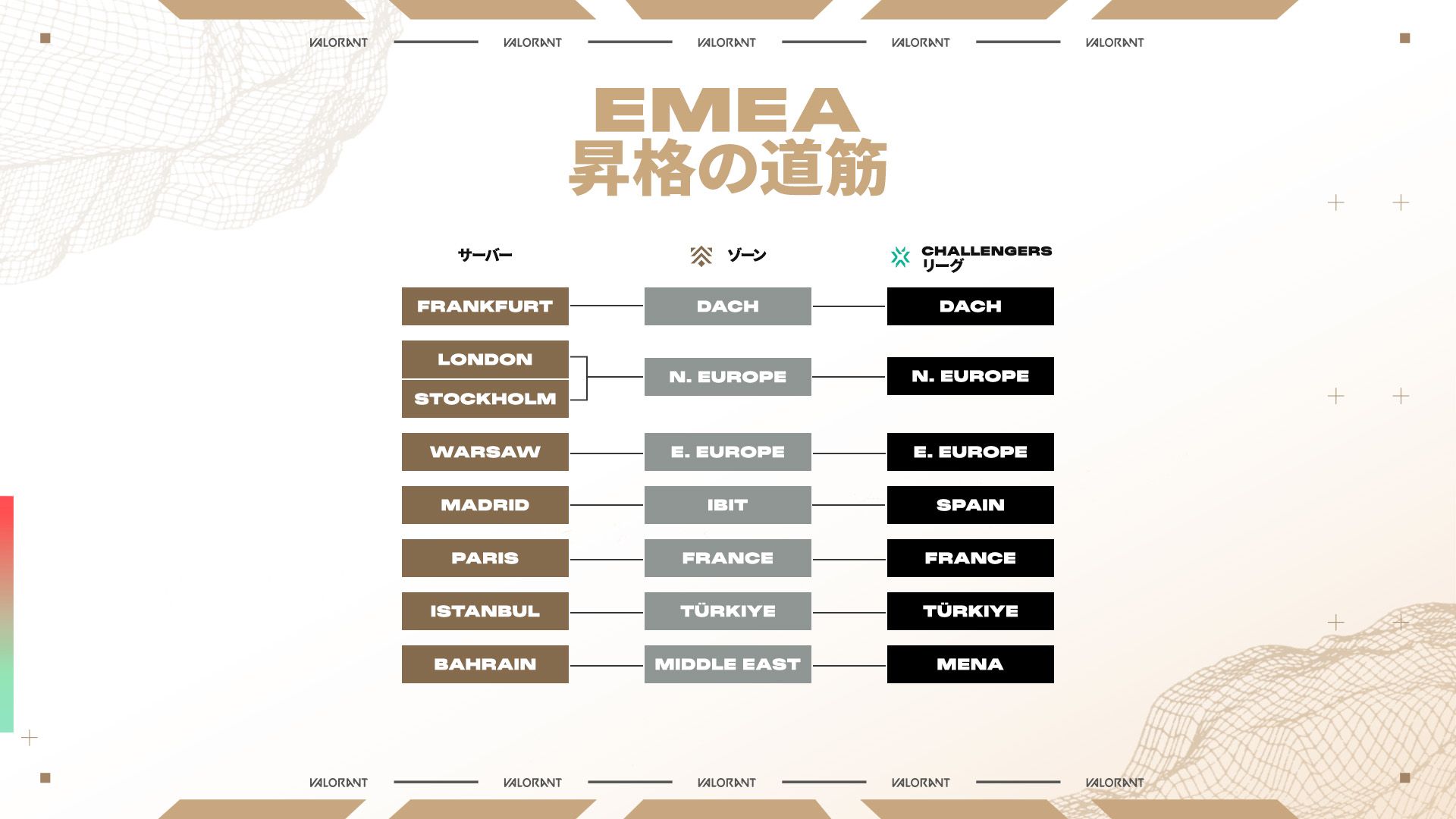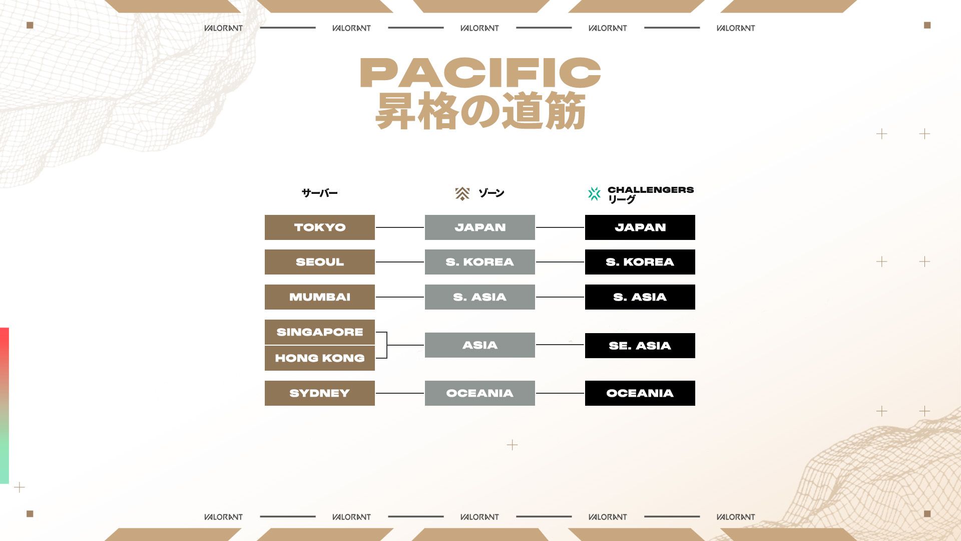 Relegate(降格):チームがStage 2のプレイオフに進出できなかった場合(インターナショナルリーグの下位4チームに入ると)、所属地域のChallengersリーグに降格します。両方のAscensionチームが降格した場合は新たに2つのチームが昇格し、強豪チームに挑む権利が与えられます。