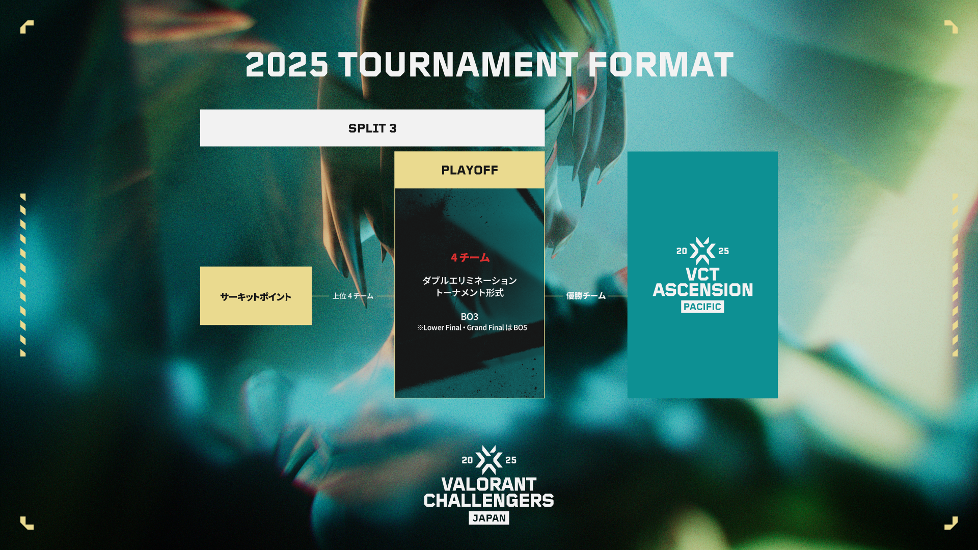 そして、2025年からは、VALORANT Challengers Japanがさらなる進化を遂げます。新たに導入されるサーキットポイント制により、年間を通じて競争がより戦略的なものとなります。シーズンを通じて「VALORANT Challengers Japan 2025 年間王者」の座と「VCT Ascension Pacific」出場権をかけた熱い戦いが展開される予定です。