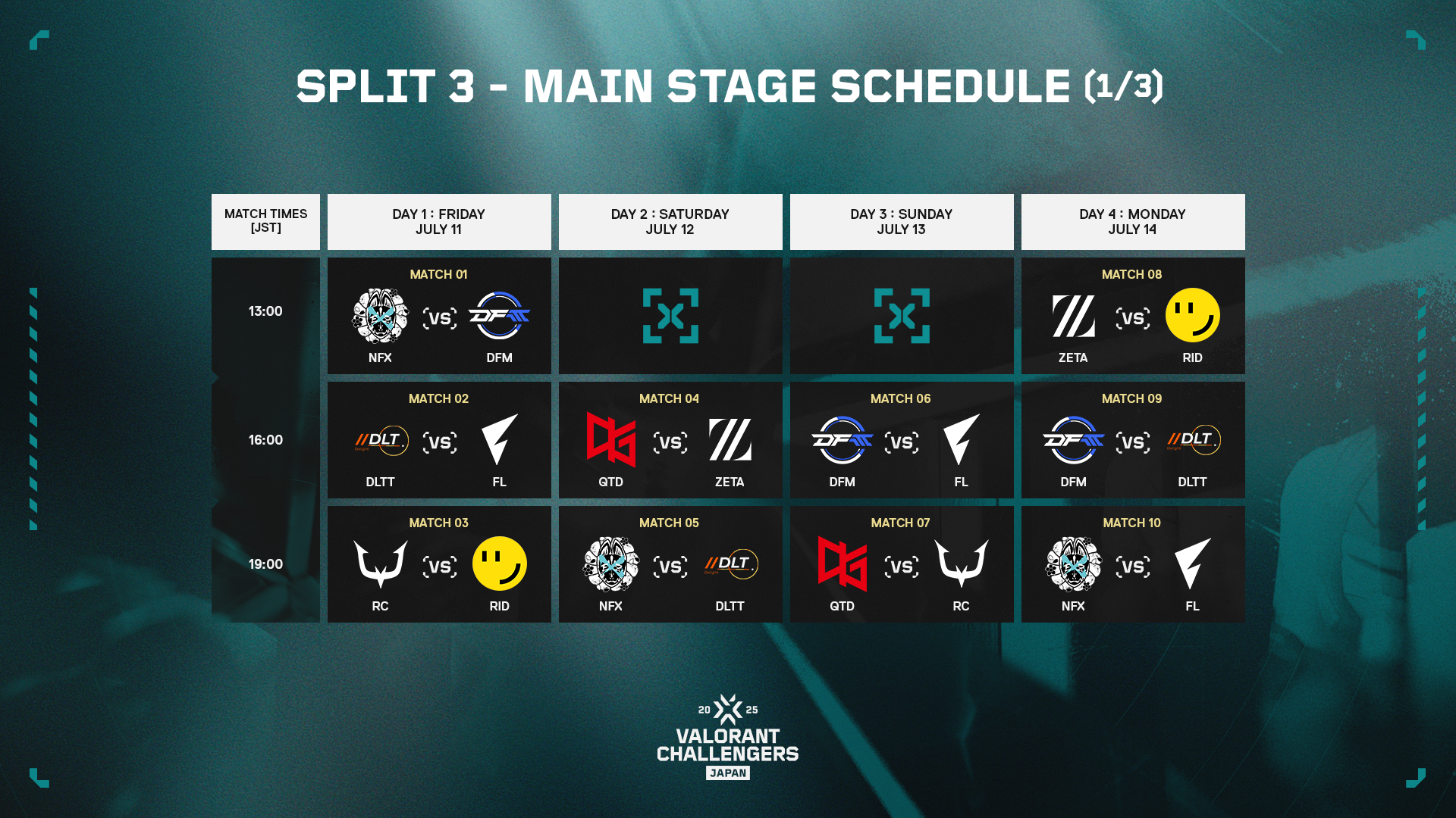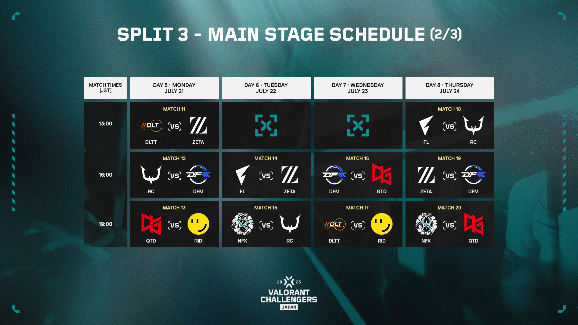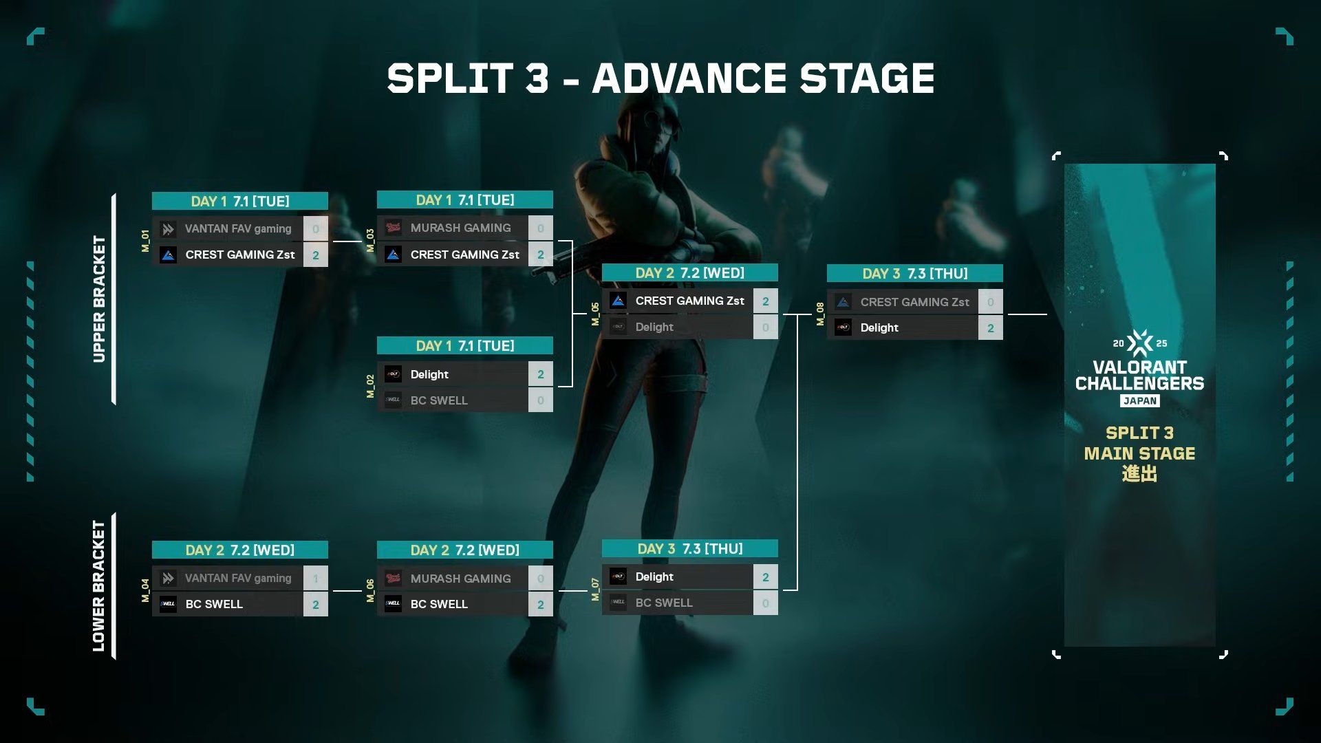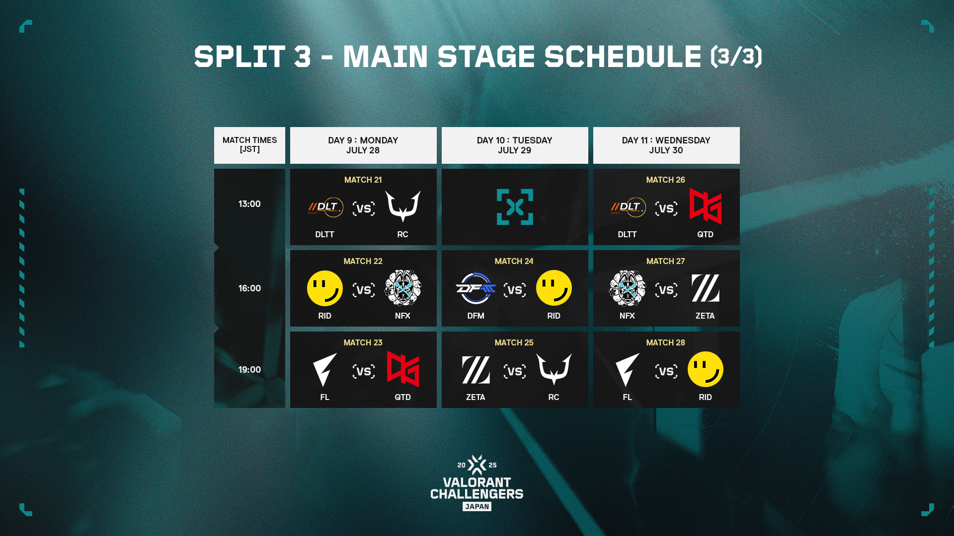 Split 2 Main Stageで上位となった5チーム、Split 3 Advance Stageを突破したDelight、アカデミーチームの2チームを加えた計8チームで、7月11日(金)12時45分からVALORANT Challengers Japan 2025を締めくくる最終章が始まります。