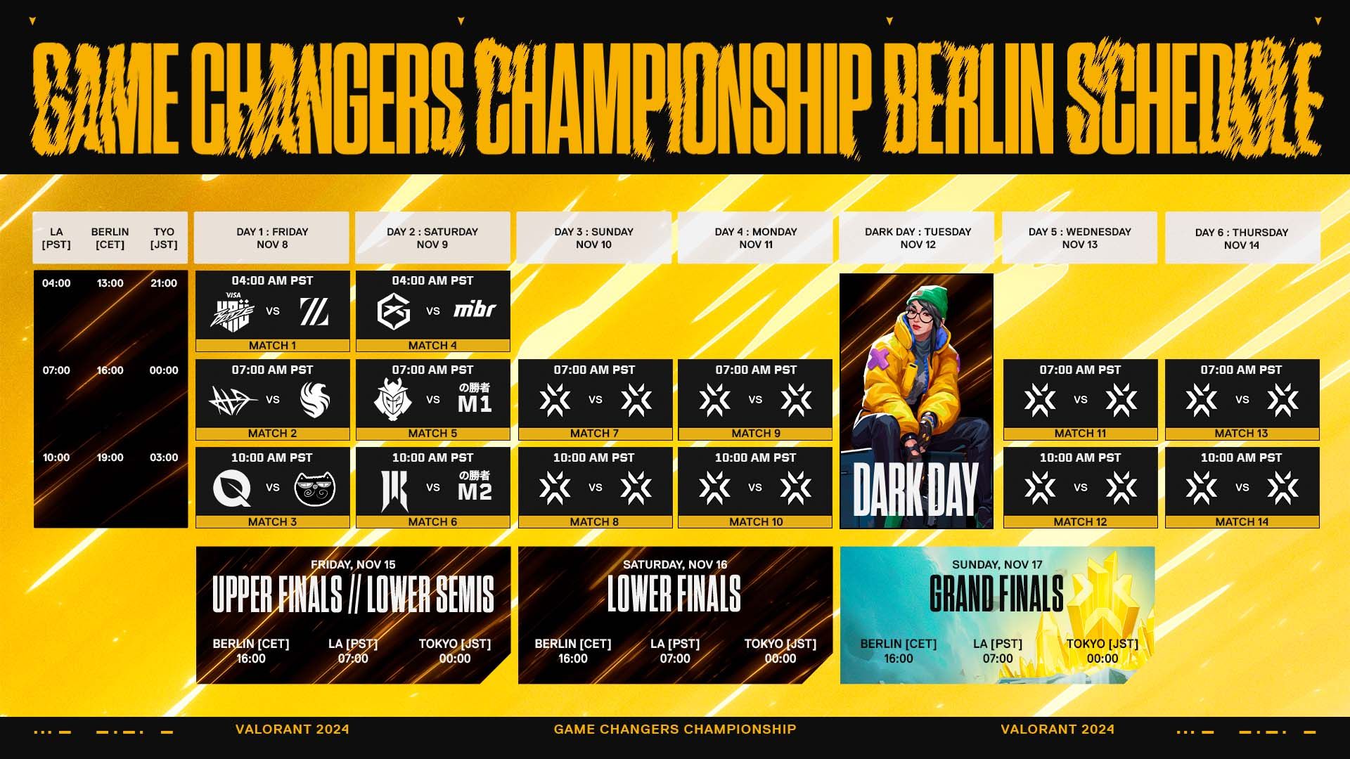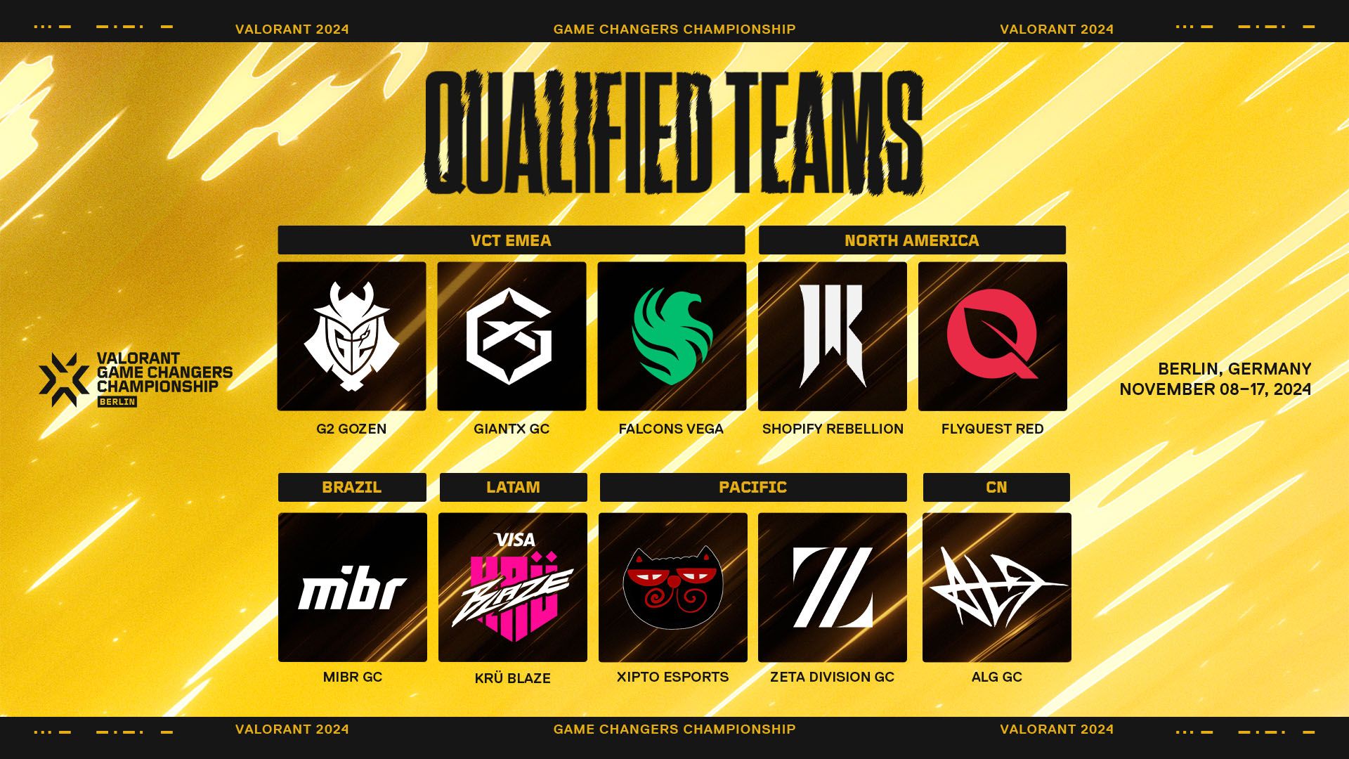 世界各地で80以上もの予選イベントが行われた1年間の激戦を経て、Game Changers Championshipの開幕が遂に目前にまで迫ってきました! 2024年11月8日~11月17日、ドイツの首都ベルリンでGCの頂点を決める戦いが開催され、次なるVALORANT Game Changers王者が決まります! 主要大会での勝利や、地域内で最多のサーキットポイント獲得などの条件達成を通じて、北アメリカ、EMEA、CN、APAC、ブラジル、ラテンアメリカの各地域を代表する10チームが出場権を獲得しています。ダブルエリミネーション形式で行われる本大会で、出場する各チームは最後の1チームとなるまで戦い抜きます。ベルリンのRiot Games Arenaで行われる大会のすべてを、twitch.tv/valorant で見届けましょう。