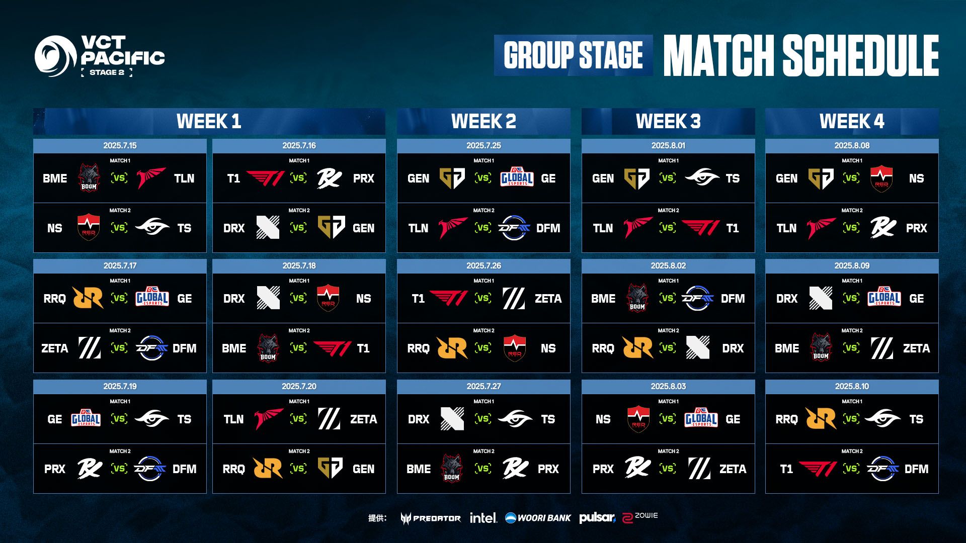 Acer、Intel、Woori Bank、Pulsar、Red Bull、ZOWIEの提供により、VCT Pacific Stage 2は多言語でライブ配信されます。各言語の放送チャンネルについては以下をご覧ください。