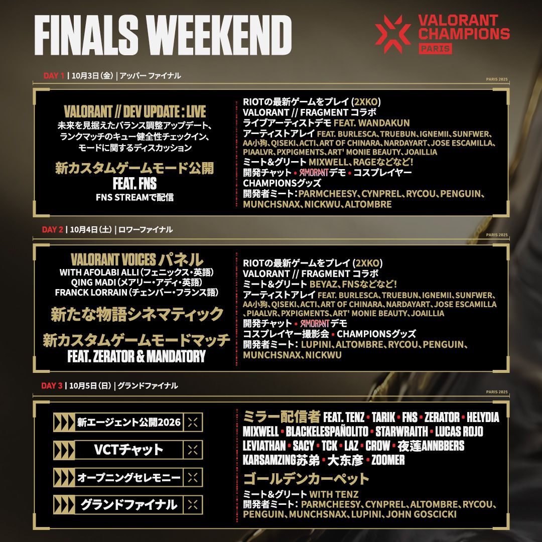 来る10月、いよいよChampions Parisが開催。Accor ArenaがVALORANT一色に染まり、ゲーム、アート、音楽、ファッションの祭典の舞台へと生まれ変わります。数か月の激闘の末、ヨーロッパ屈指の舞台で新たな世界王者が誕生します。さらに、王者の誕生を待つ間も、ライブアートのデモ、VALORANTの未来を紹介する開発パネル、コミュニティが交流できるロールゾーン、ゴールドカーペットで彩られたオープニングセレモニーなど、グランドファイナルの熱気を先取りできる催し物が目白押しです。