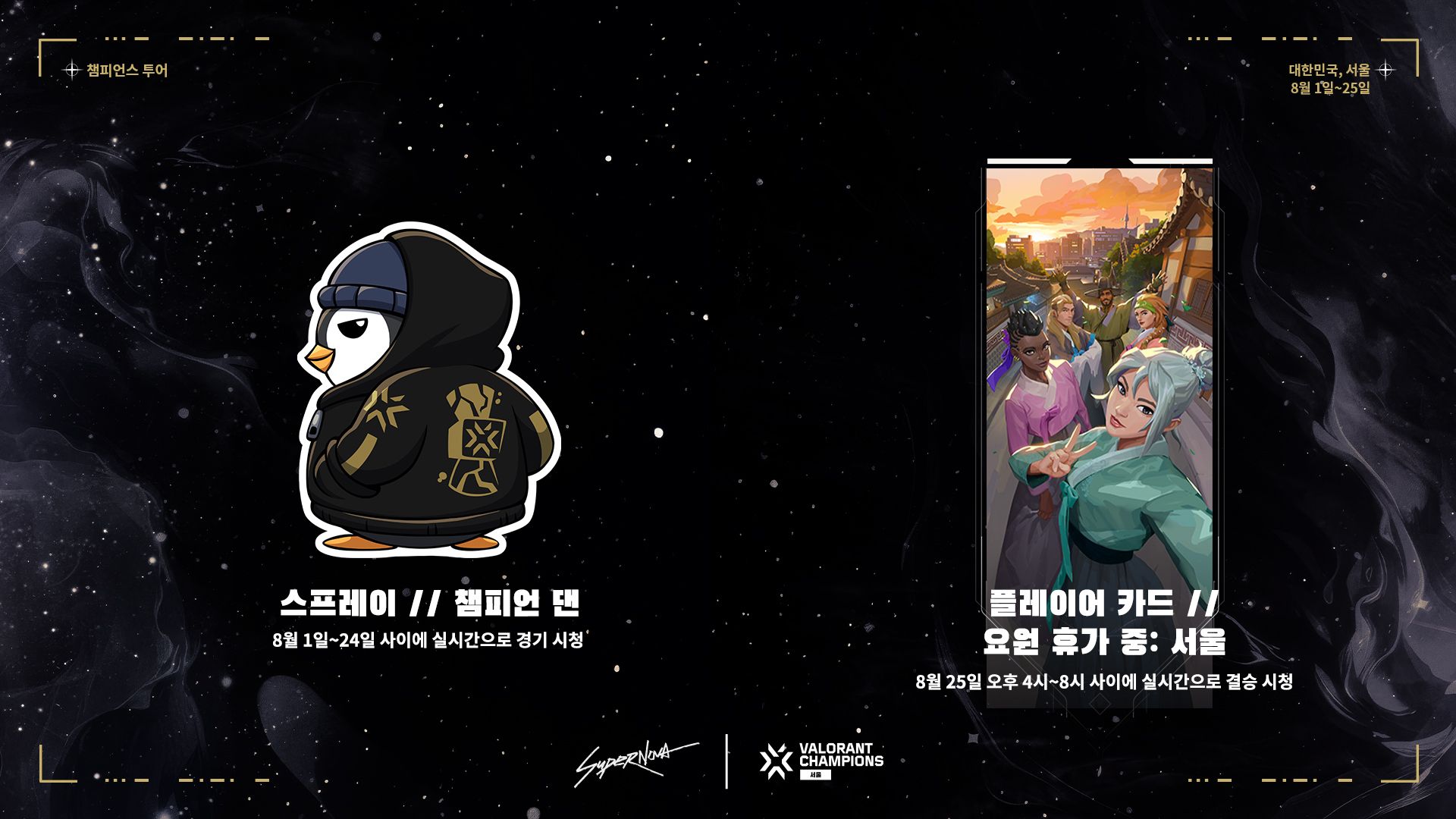 챔피언스 서울 기간 동안 실시간으로 경기를 시청하고 한정 드롭을 획득하세요! 챔피언스 서울 드롭에는 개최 지역을 나타내는 스프레이 및 카드가 포함됩니다. 스프레이에는 발로란트의 전략가 친구를, 플레이어 카드에는 한국의 전통 의복을 담았습니다.