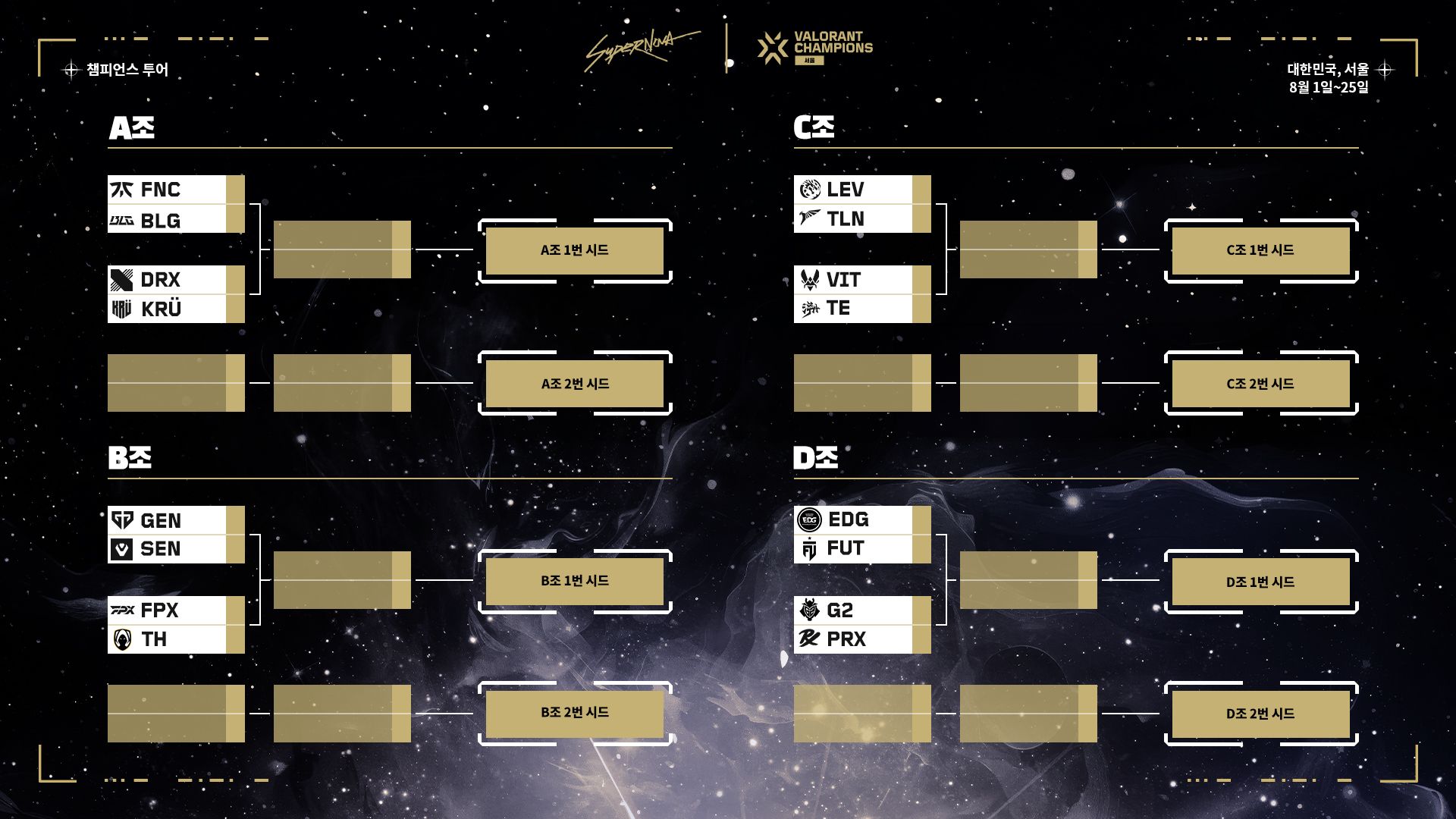 그룹 스테이지는 16개 팀이 4개 조로 나뉘어 진행되며 조마다 발로란트의 4개 국제 리그 소속 팀이 하나씩 배정됩니다. 이 스테이지에서 각 팀은 더블 엘리미네이션 형식으로 경기를 치르고 각 조에서 두 팀이 다음 스테이지에 진출합니다.