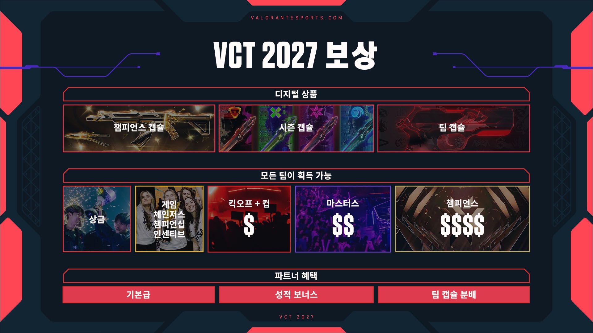 오늘은 내년 발로란트 e스포츠의 변경사항에 대한 최신 소식을 공개합니다. 2027년 VCT는 토너먼트 모델로 전환됩니다. 이 모델에서는 시즌 내내 결정적인 경기를 더 많이 선보이고, 보다 팬들 가까이에서 새 이벤트를 개최하고, VCT의 글로벌 이벤트인 마스터스와 챔피언스를 위한 예선에 누구나 참여할 수 있는 새 방식을 도입합니다. 이 새로운 구조는 다음과 같은 원칙에 집중합니다.