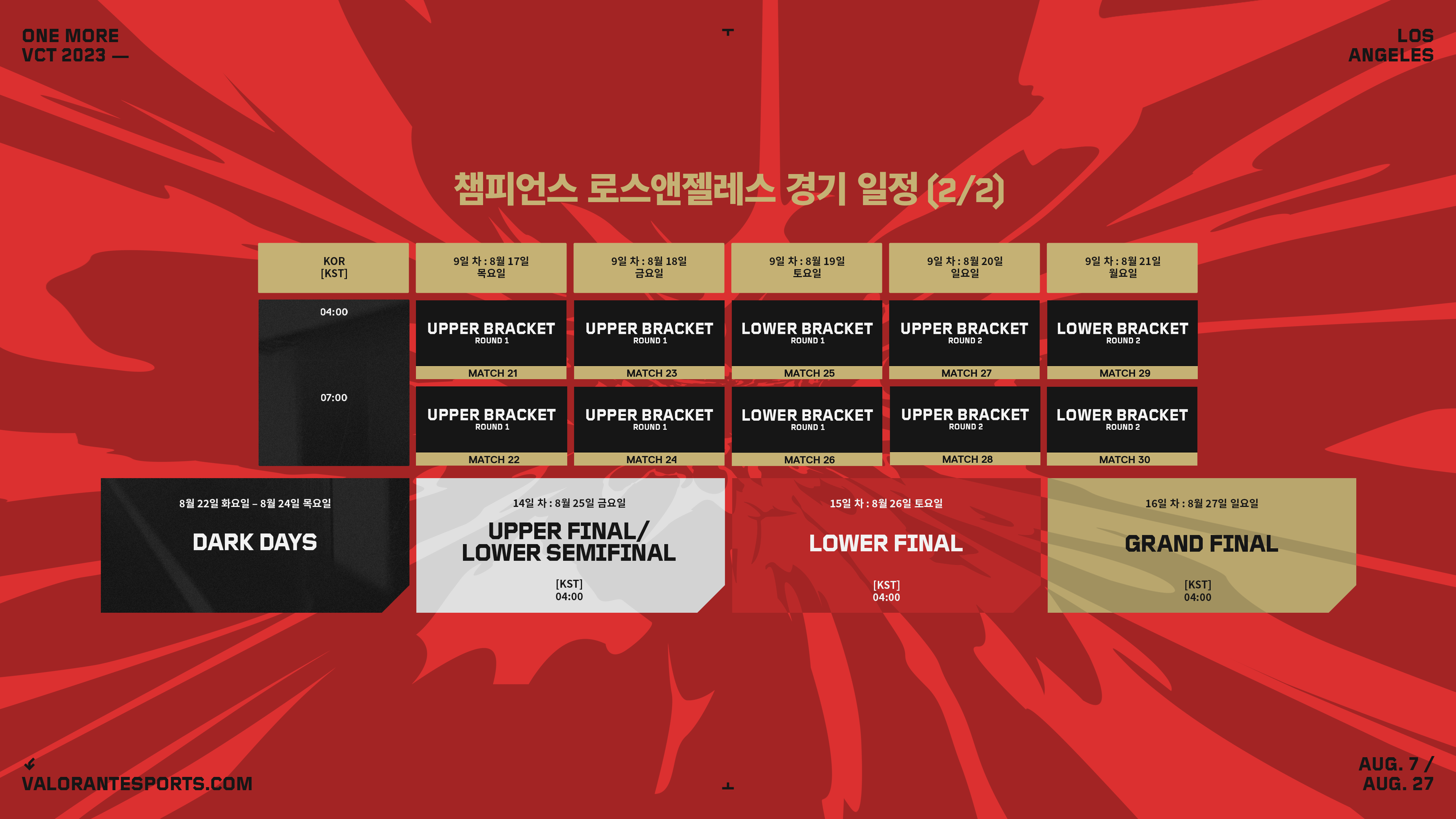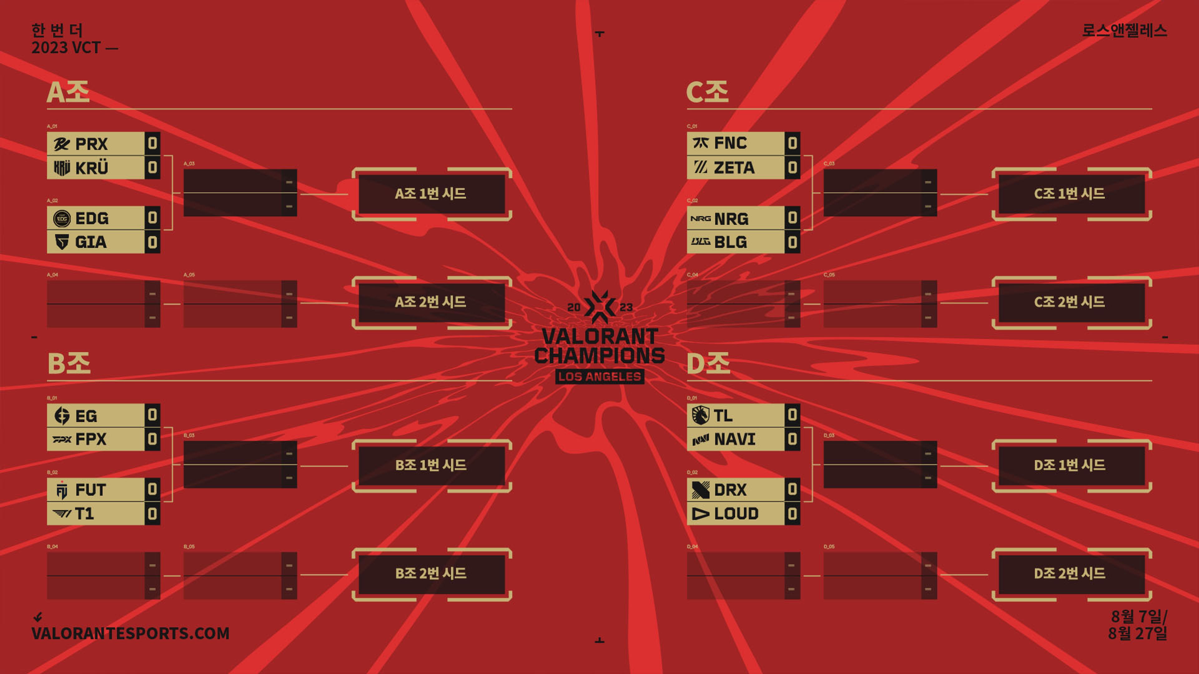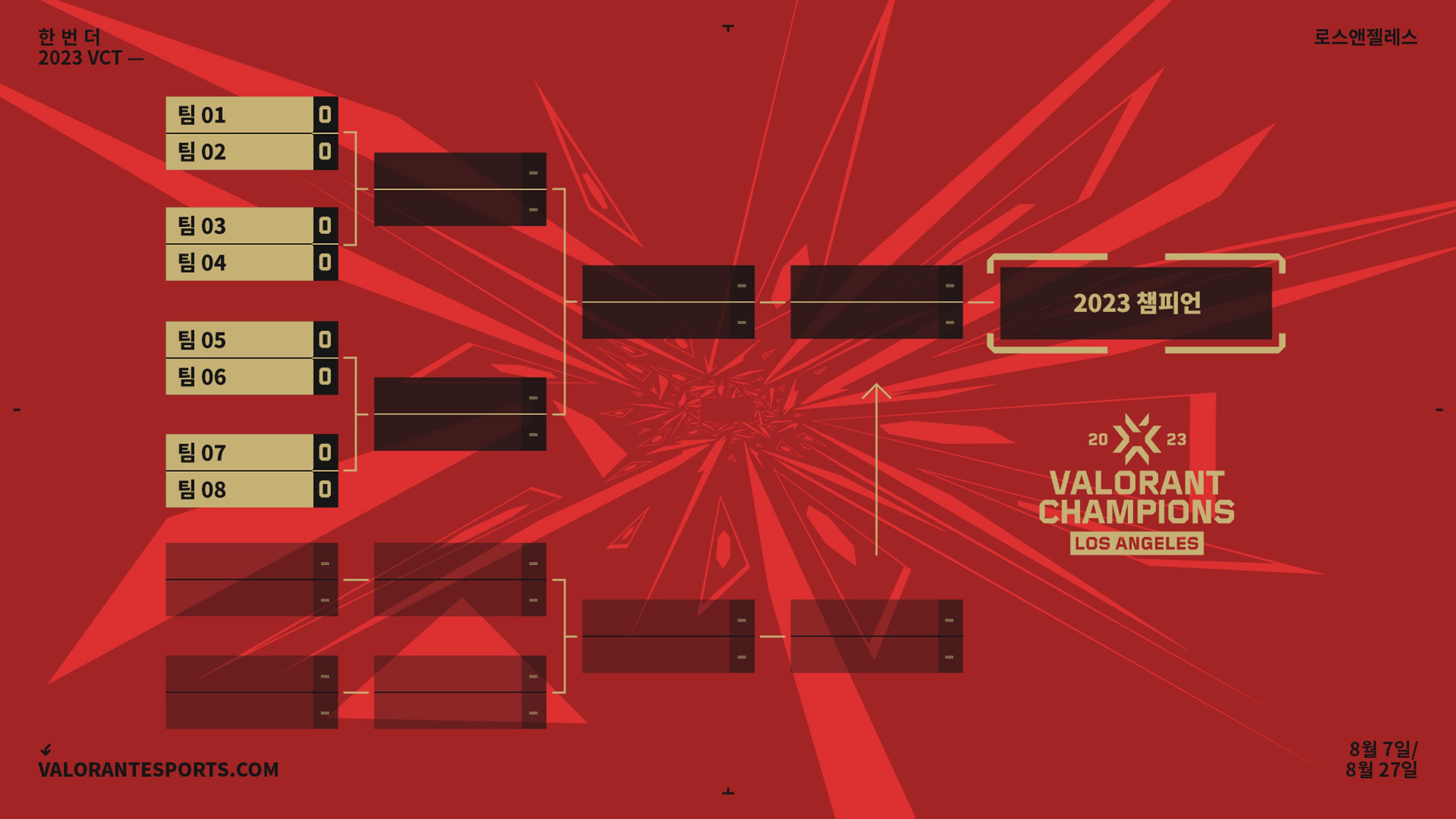 이 8개 팀은 무작위로 더블 엘리미네이션 대진에 배정되지만, 같은 조에서 진출한 팀은 대진의 정반대 편에 배정됩니다. 이 팀들은 마지막 한 팀이 남을 때까지 각 대진 라운드를 진행하며 최후의 한 팀이 발로란트 월드 챔피언의 칭호를 얻게 됩니다.
