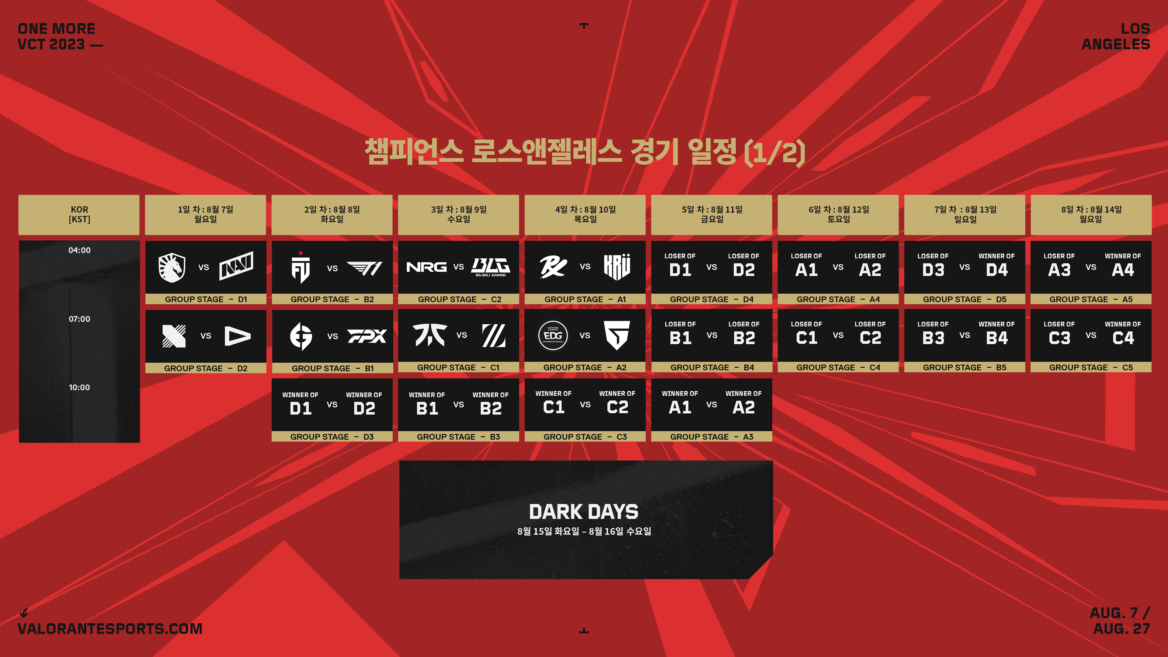 대회는 8월 7일 오전 4시에 시작되며 전체 대회 일정은 아래에서 확인하실 수 있습니다.