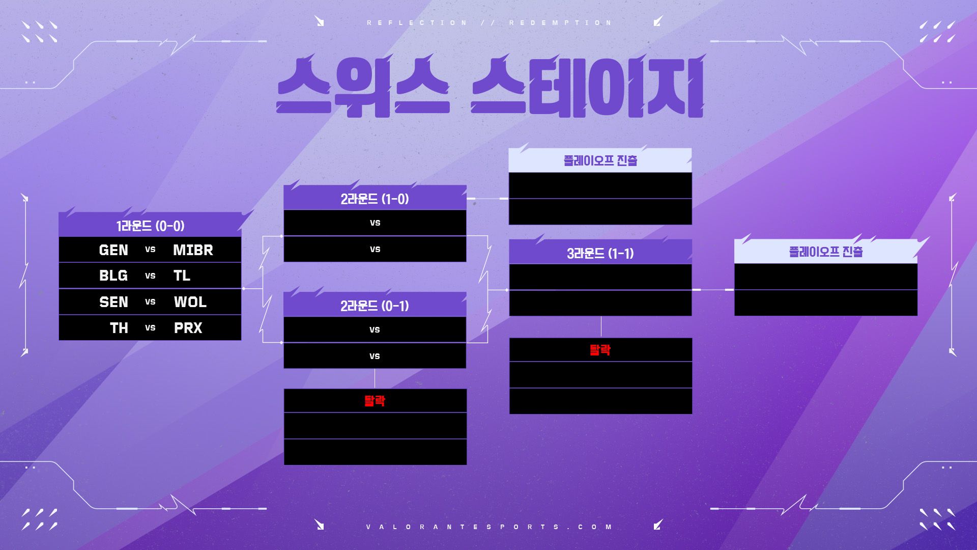 나머지 8개 팀은 스위스 스테이지에서 시작하여 단 4개 팀만 플레이오프에 진출합니다. 2승을 달성하면 진출하며, 2패를 할 경우에는 탈락합니다. 모든 경기는 3판 2선승제로 진행됩니다.