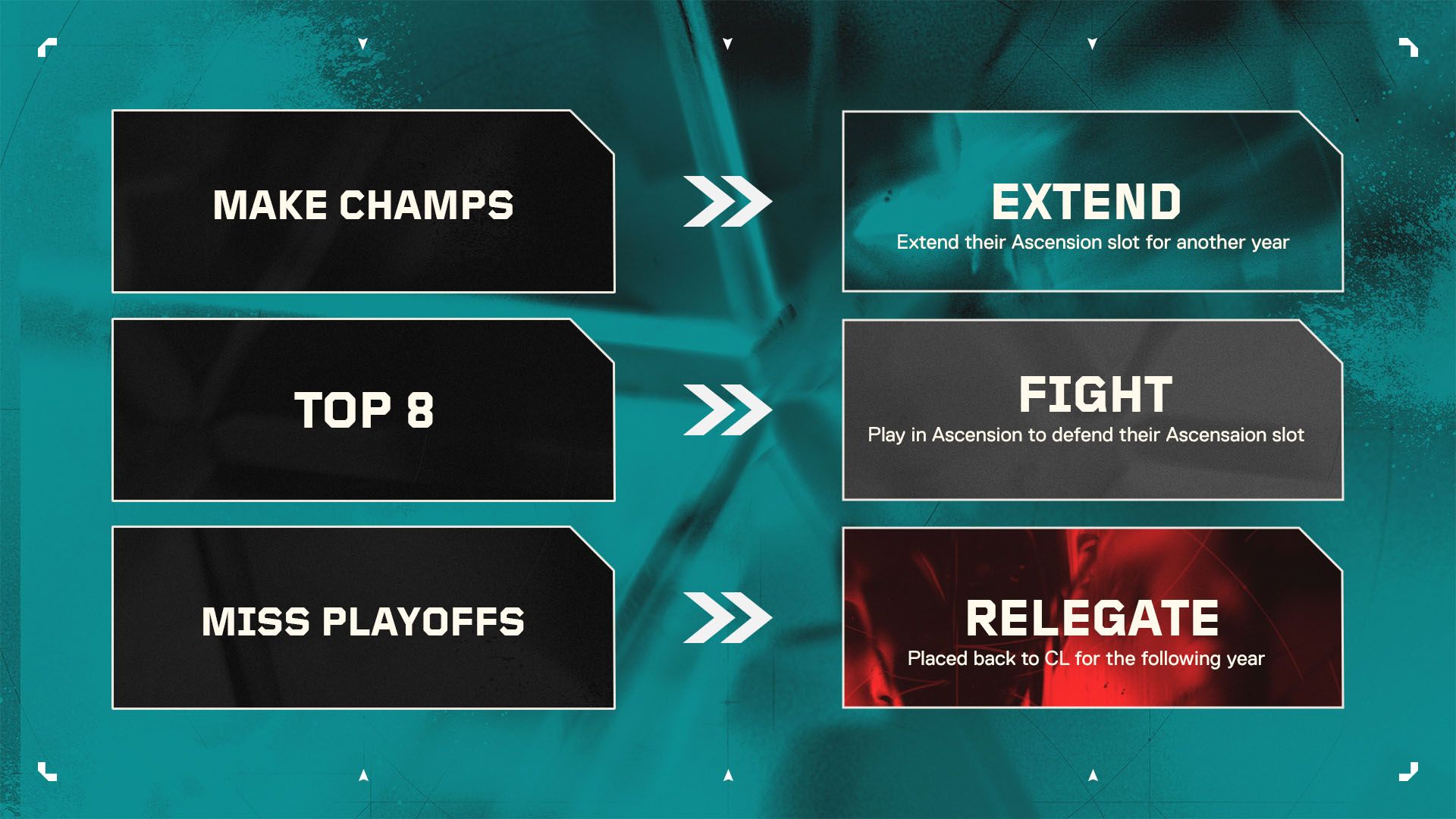 Following those criteria, an invited team can extend its spot in VCT Americas, compete in Ascension to defend it, or be relegated to Challengers.