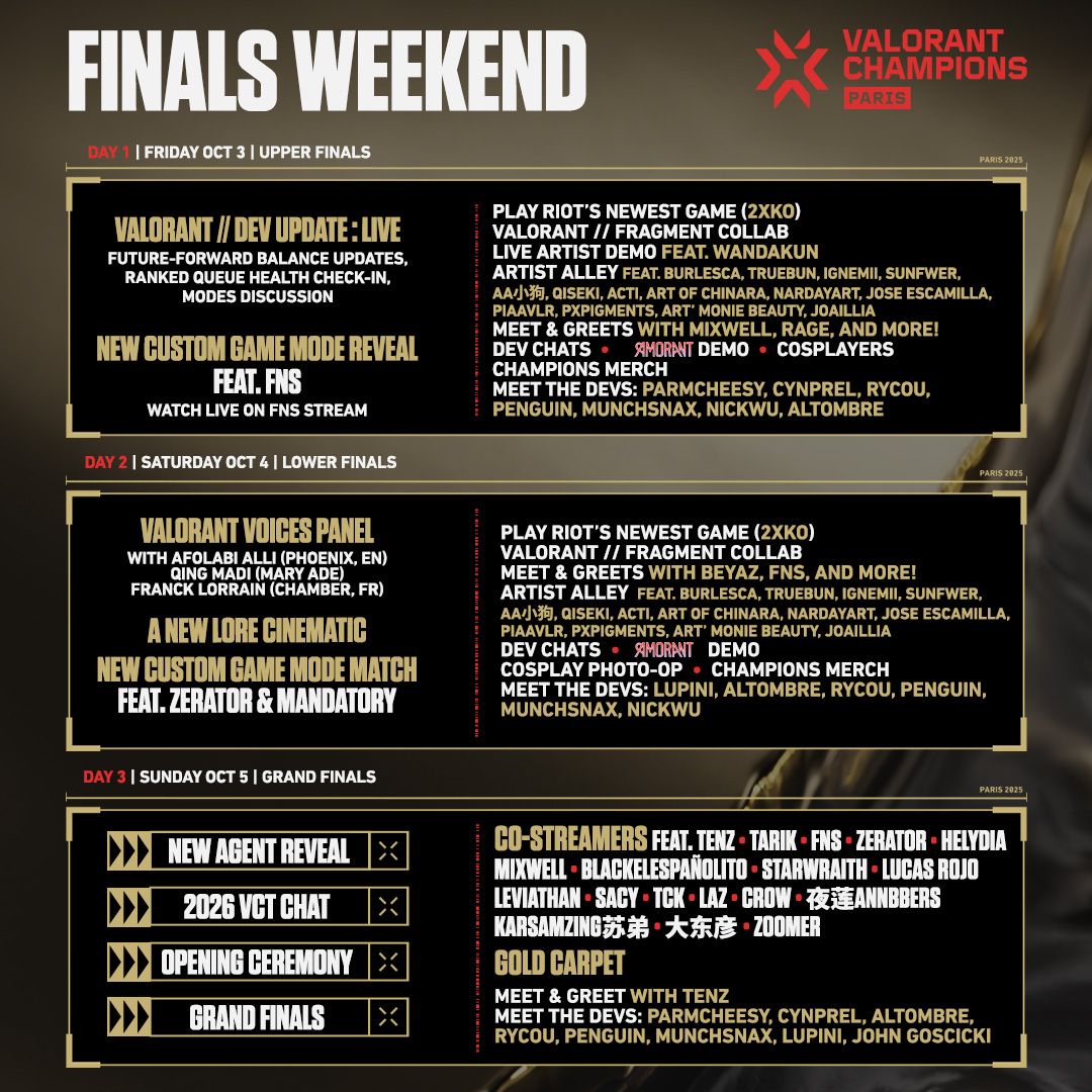 This October, Champions Paris becomes the epicenter of VALORANT as the Accor Arena transforms into a celebration of game, art, music, and fashion. After months of anticipation, the journey culminates with the crowning of a world champion inside one of Europe’s most iconic venues. But before a trophy is hoisted, fans will step into live artist demos, development panels revealing the game’s future, role zones where communities connect, and the gold-carpeted opening ceremony that sets the stage for the Grand Final.