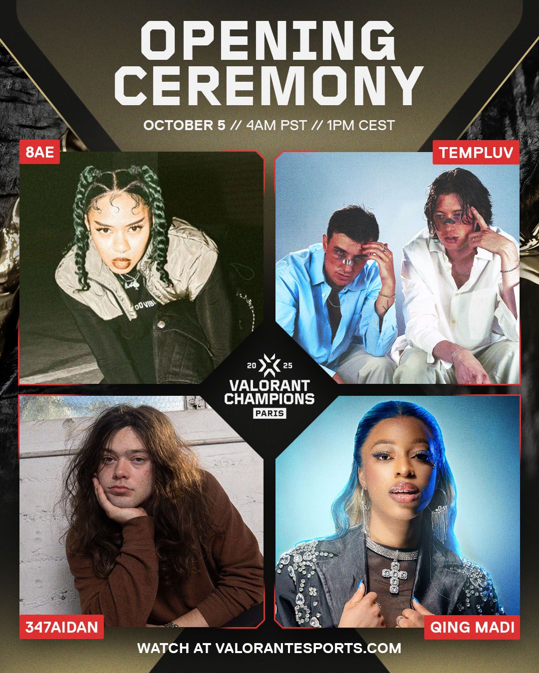 On October 5, Grand Finals Day, the Opening Ceremony will transform the Accor Arena into a global stage featuring Qing Madi, Julian (Templuv), Brodin, and 347Aidan.