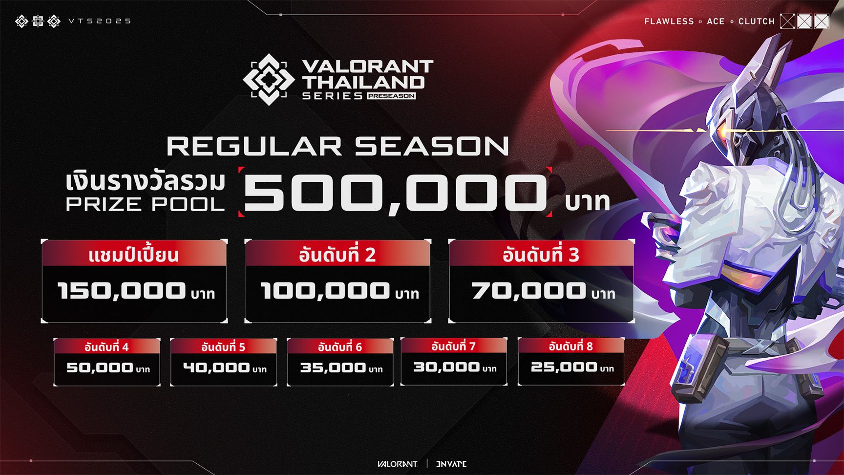 สัดส่วนการแบ่งเงินรางวัล 8 อันดับ ในการแข่งขัน VALORANT Thailand Series 2025 Preseason รอบ Regular Season