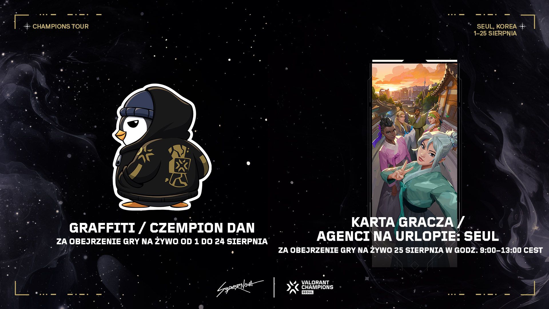 Załapcie się na mecze na żywo w trakcie Champions Seoul, by zdobyć wyjątkowe nagrody! Dropy podczas Champions Seoul obejmują graffiti i kartę reprezentującą region gospodarzy. Graffiti jest ukłonem w stronę taktycznych zwierzaków w VALORANT, podczas gdy karta nawiązuje do tradycyjnego koreańskiego stroju.
