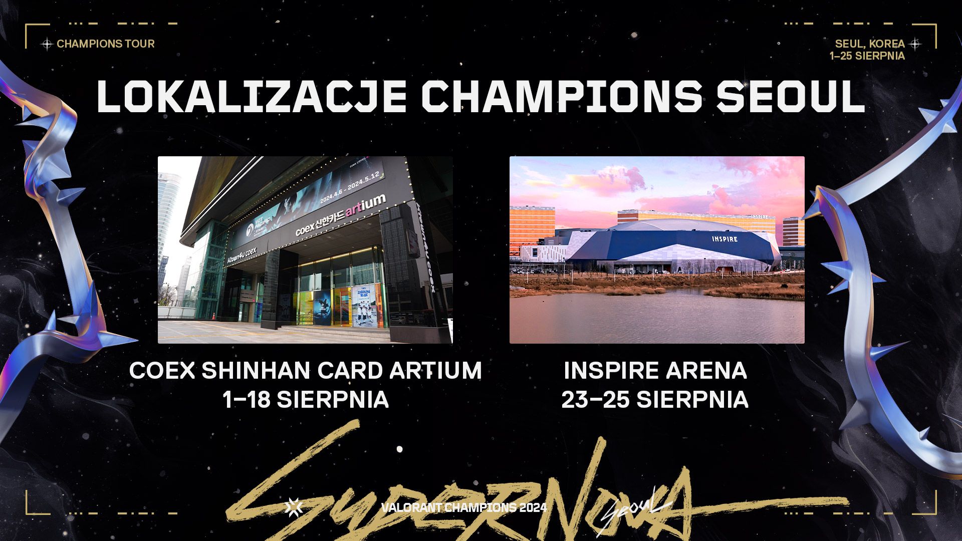 Wydarzenie zacznie się w COEX Shinhan Card Artium, siedzibie ligi międzynarodowej VCT PACIFIC, a zakończy się na INSPIRE Arena! Dzięki dużej pojemności i luksusowym udogodnieniom INSPIRE Arena będzie gospodarzem epickiego zakończenia VALORANT Champions Tour 2024.