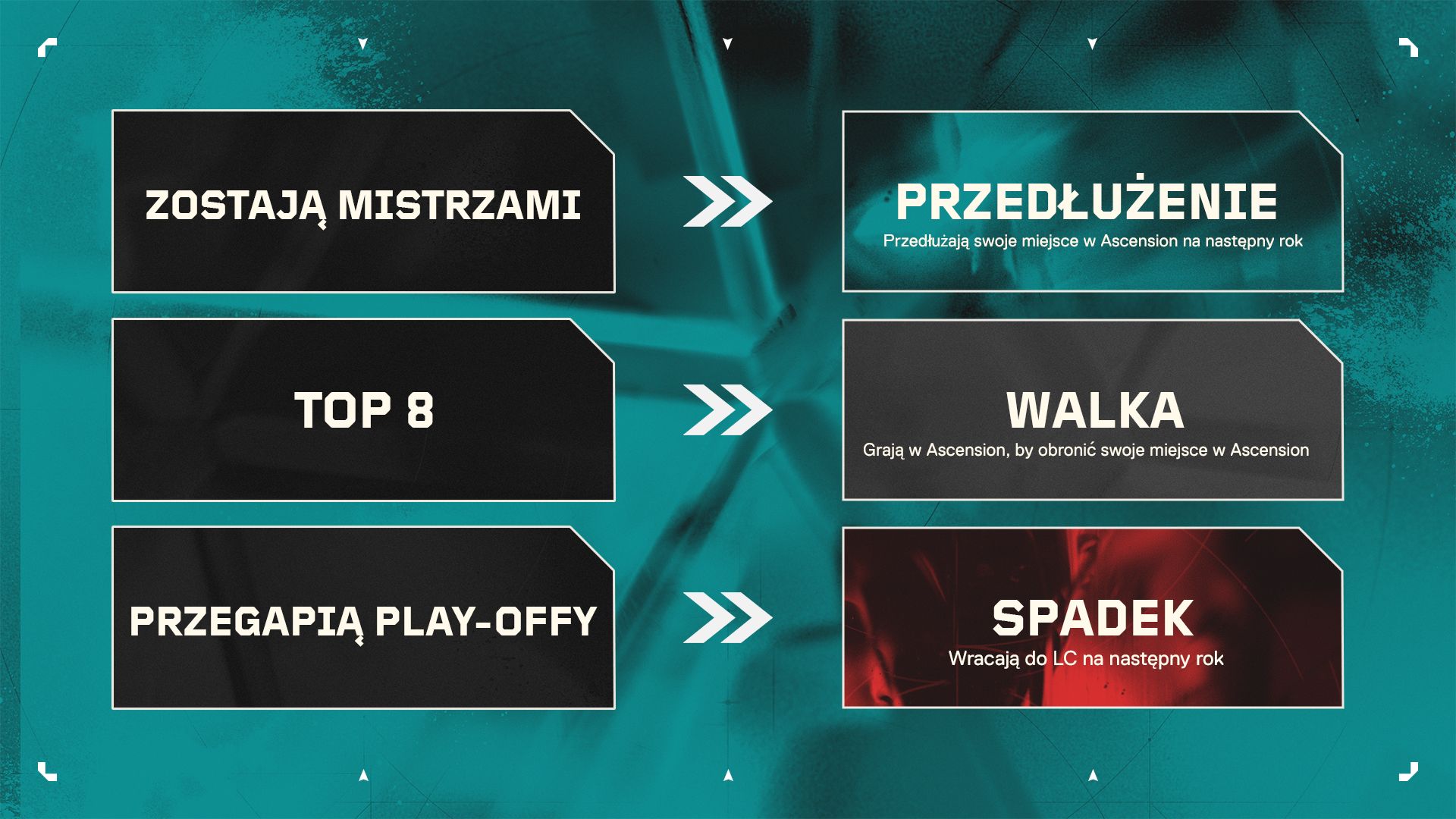 Spadek: jeśli drużynie nie uda się awansować do drugiego etapu play-offów (ostatnia czwórka w LM), spadnie ona z powrotem do odpowiedniej ligi Challengers. Jeśli oba zespoły Ascension zanotują spadek, wprowadzimy dwie nowe drużyny, aby dać im szansę na zdetronizowanie najlepszych zespołów.