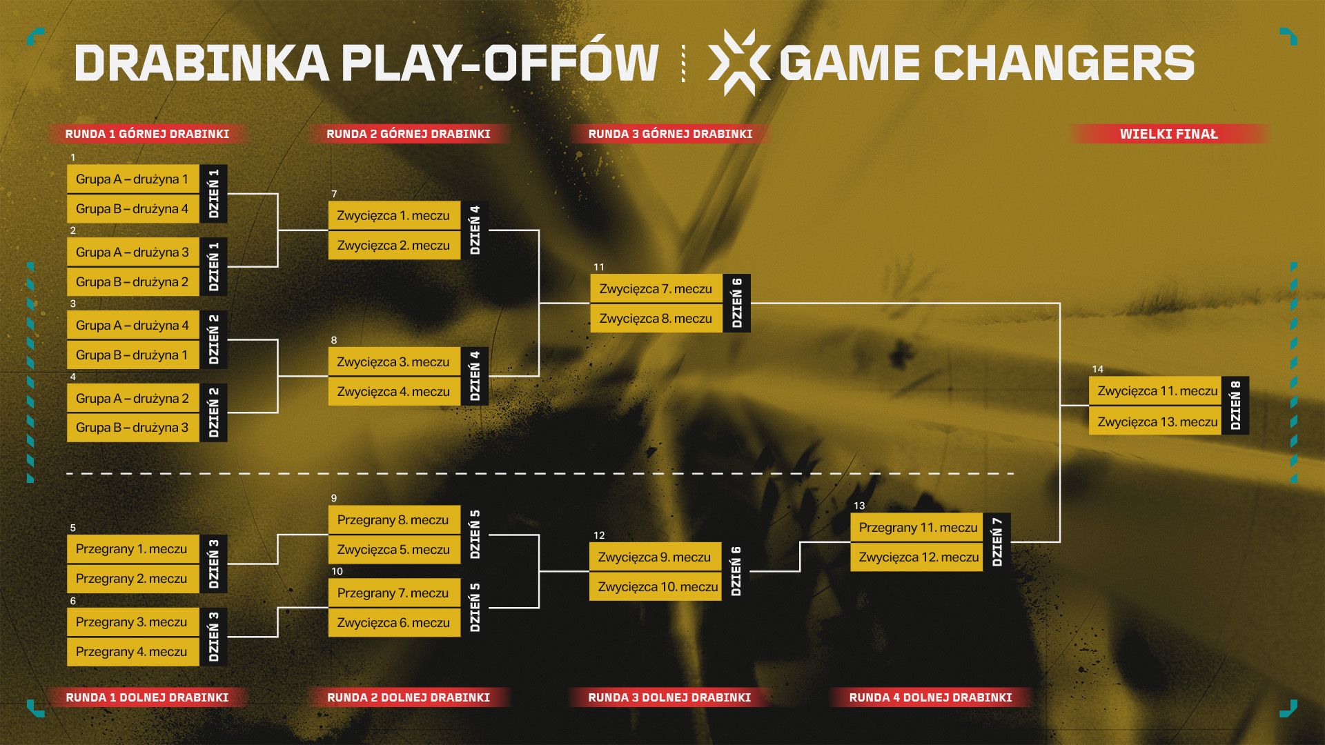 Finał górnej drabinki to mecz do dwóch wygranych, a finał dolnej drabinki to mecz do trzech wygranych. Wielki finał również będzie do trzech zwycięstw.