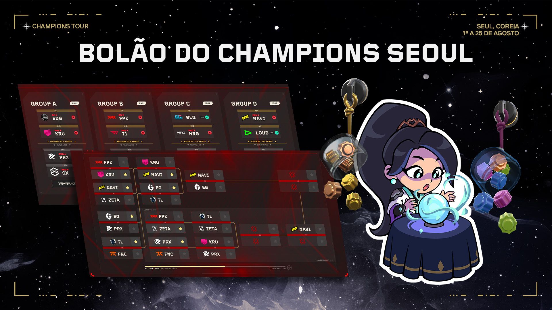 Estamos empolgados por finalmente podermos trazer para vocês o Bolão com o apoio da AWS! Você pode dar seus palpites tanto dentro do jogo (através da Central de Esports) quanto no site valorantesports.com. Ganhe diferentes recompensas de acordo com a qualidade dos seus palpites e compare com seus amigos, outros jogadores e até com criadores de conteúdo do VALORANT na Tabela da Comunidade.