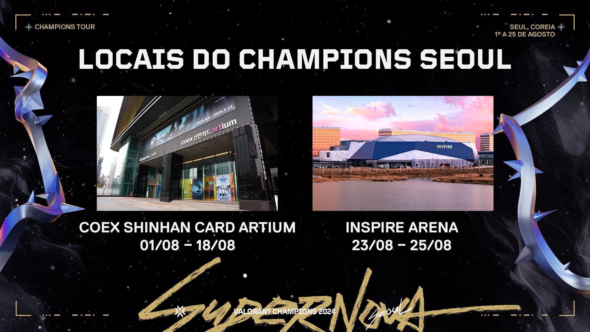 O evento começará no COEX ShinhanCard Artium, sede da Liga Internacional VCT PACIFIC, e terminará na INSPIRE Arena! Com sua grande capacidade de público e instalações luxuosas, a INSPIRE Arena está pronta para sediar um encerramento épico do VALORANT Champions Tour 2024.