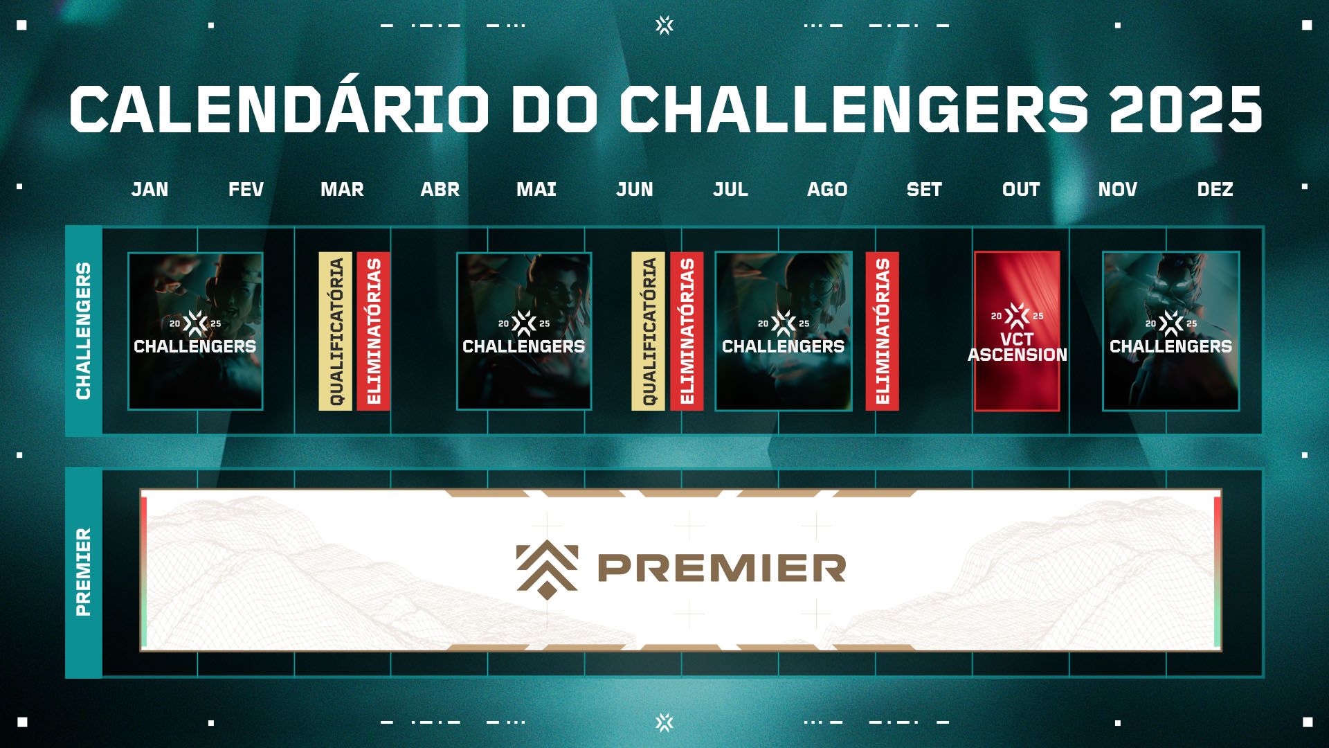 Agora que estamos na reta final do ano, vamos compartilhar alguns detalhes iniciais sobre a temporada de 2025 do Challengers. Nesta próxima etapa, queremos continuar aprofundando a conexão entre o Challengers e todas as partes do ecossistema do VCT. A Liga Challengers é um nível essencial da competição, em que jogadores promissores podem aperfeiçoar as habilidades e ganhar reconhecimento. Como em 2024, o Challengers vai se estender pelo ano inteiro: o início das competições será em janeiro, culminando com o Ascension em outubro e concluindo em dezembro com os torneios Challengers e Premier.