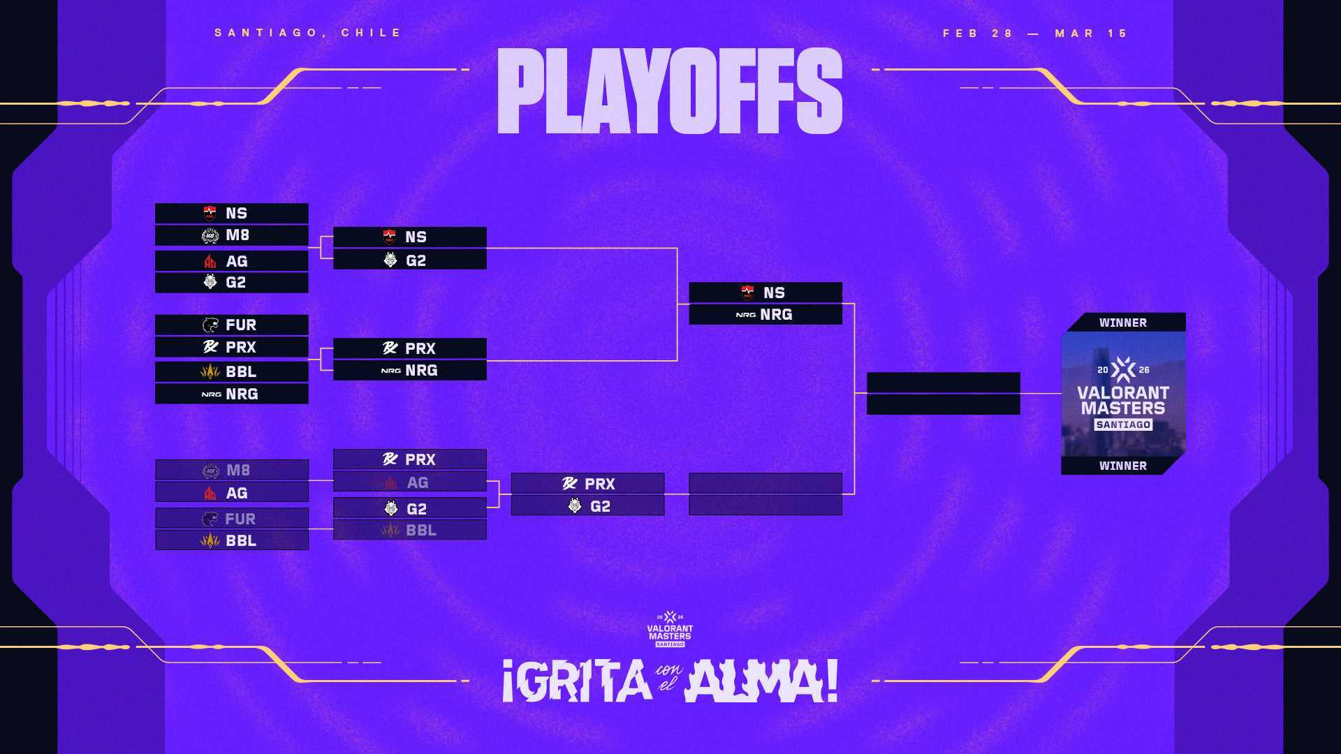 Quatro equipes encararam a bronca de toda a chave para ganhar seu espaço no fim de semana da final. Cada elenco provou que consegue se adaptar sob pressão e dar seu melhor quando mais importa. Após a Grande Final, fique de olho no momento em que entregaremos o Bracelete MVP do Masters Santiago ao jogador que definiu o torneio com seu desempenho.