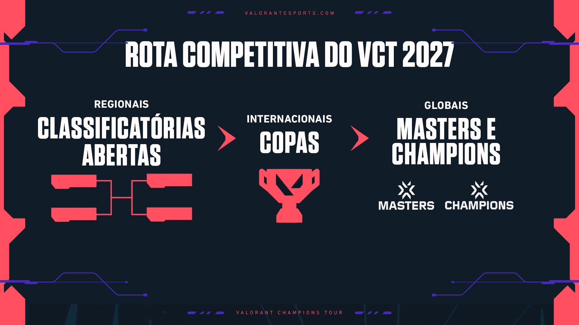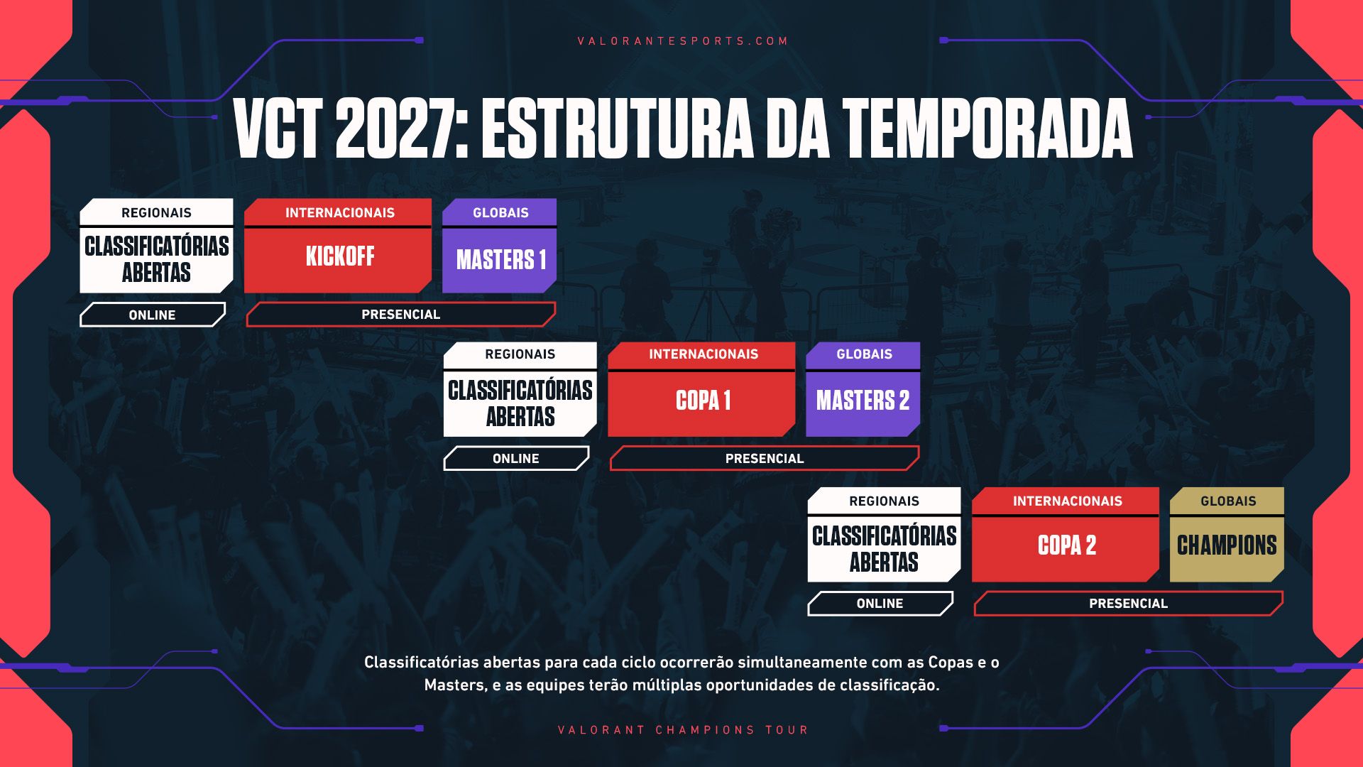 Hoje, viemos compartilhar a primeira parte de uma série de notícias sobre mudanças futuras nos Esports do VALORANT no ano que vem. Em 2027, o VCT introduzirá um modelo de torneio envolvendo mais momentos de alta pressão durante a temporada, novos eventos mais perto de você, e mais formas para qualquer equipe se classificar para os eventos globais do VCT: Masters e Champions.