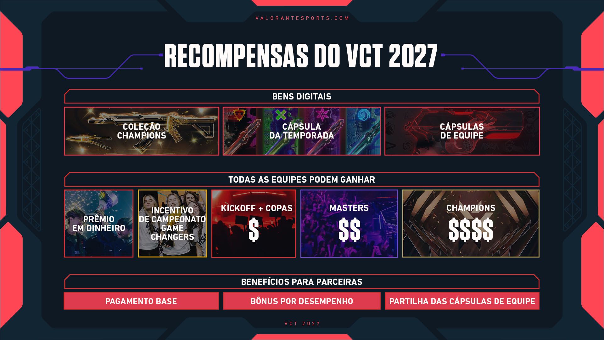 Tivemos muito sucesso com os bens digitais de esports do VALORANT, graças a todos os fãs que se comprometem a representar e apoiar suas equipes e jogadores favoritos. Só no último ano, dividimos mais de 86 milhões de dólares vindos de bens digitais com equipes no VCT, criando um ambiente saudável e sustentável para viabilizar a operação de equipes. A partir de 2027, queremos que toda equipe competindo nos níveis mais altos possam ter acesso em potencial ao mesmo sucesso financeiro.