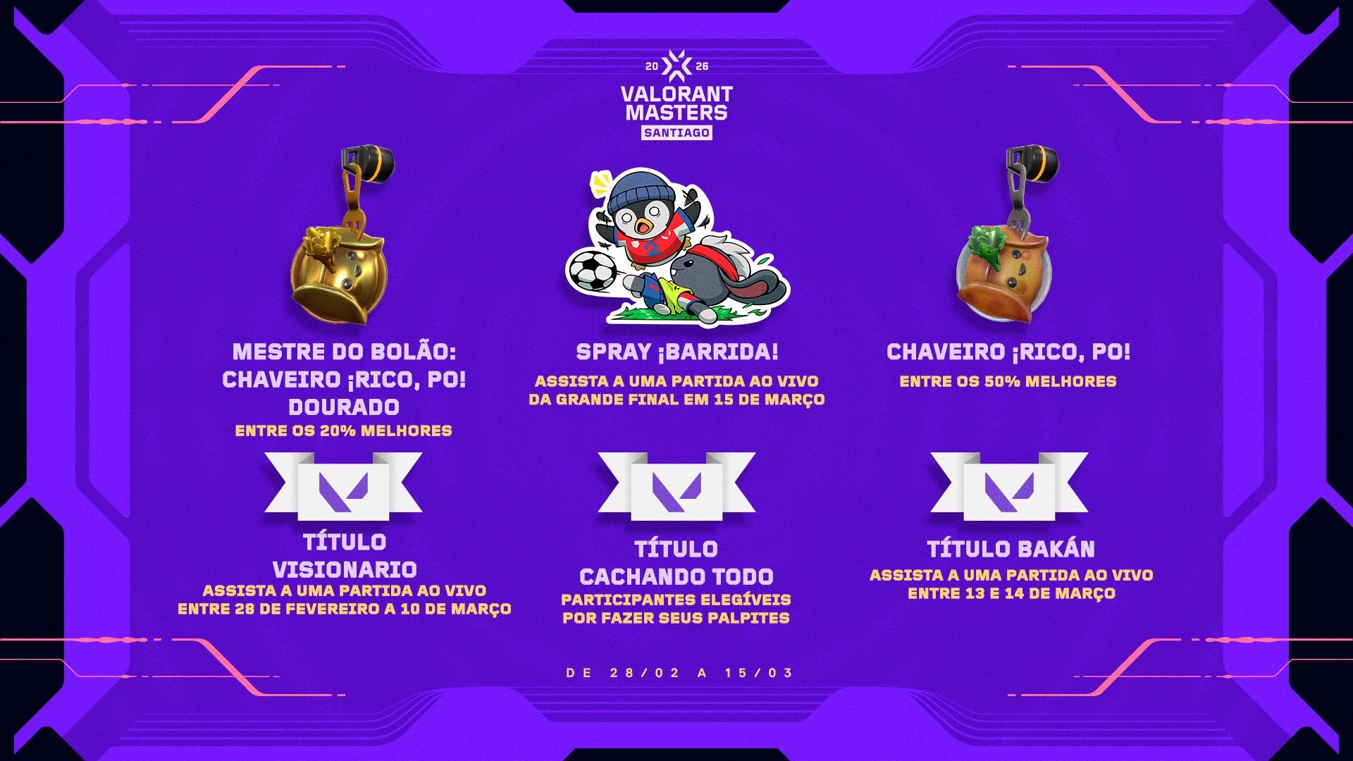 Venha assistir o Masters Santiago ao vivo para ganhar Drops exclusivos, incluindo um Título e Spray oficiais só por assistir. Define seus palpites e veja como suas previsões se comparam às do resto do mundo.